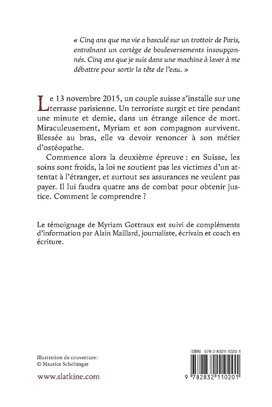 Le 13 novembre 2015, un couple suisse s’installe sur une terrasse parisienne. Un terroriste surgit et tire pendant une minute et demie, dans un étrange silence de mort. Miraculeusement, Myriam et son compagnon survivent. Blessée au bras, elle va devoir renoncer à son métier d’ostéopathe.