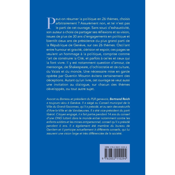 Peut-on résumer la politique en 26 thèmes, choisis arbitrairement ? Assurément non, et tel n’est pas le parti de cet ouvrage. Sans souci d’exhaustivité, son auteur a choisi de partager ses réflexions et sa vision, issues de plus de 30 ans d’engagements en politique et bientôt deux ans de présidence du plus grand parti de la République de Genève, sur ces 26 thèmes. Oscillant entre humour et gravité, dérision et espoir, ces pages se veulent un hommage à la politique, comprise comme l’art de construire la Cité, et parfois à celles et ceux qui la font vivre. Il y est notamment question d’amour, de mensonge, de Shakespeare, d’ochlocratie et de culture, du Valais et du monde. Une nécessaire mise en garde