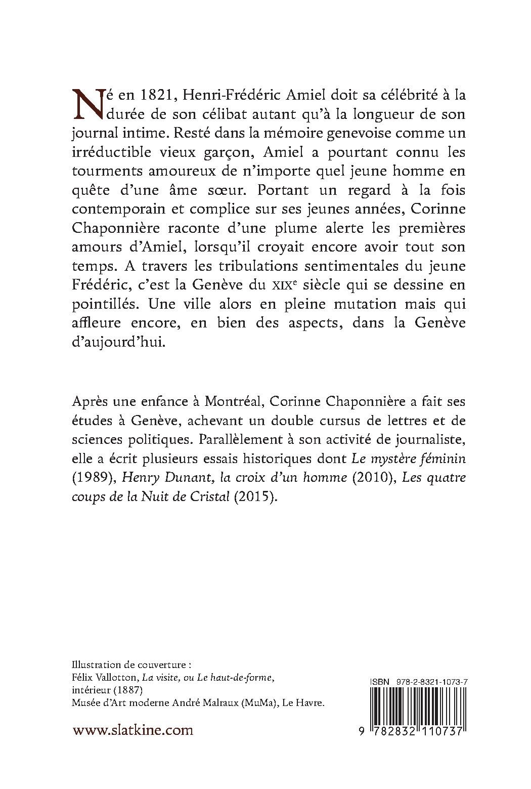 Né en 1821, Henri-Frédéric Amiel doit sa célébrité à la durée de son célibat autant qu’à la longueur de son journal intime. Resté dans la mémoire genevoise comme un irréductible vieux garçon, Amiel a pourtant connu les tourments amoureux de n’importe quel jeune homme en quête d’une âme soeur. Portant un regard à la fois contemporain et complice sur ses jeunes années, Corinne Chaponnière raconte d’une plume alerte les premières amours d’Amiel, lorsqu’il croyait encore avoir tout son temps. A travers les tribulations sentimentales du jeune Frédéric, c’est la Genève du XIXe siècle qui se dessine en pointillés. Une ville alors en pleine mutation mais qui affleure encore, en bien des aspects, dans la Genève d’aujourd’hui.
