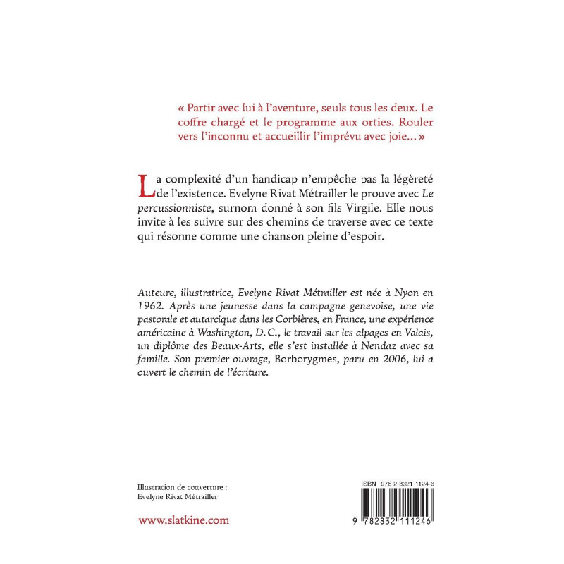 La complexité d’un handicap n’empêche pas la légèreté de l’existence. Evelyne Rivat Métrailler le prouve avec Le percussionniste, surnom donné à son fils Virgile. Elle nous invite à les suivre sur des chemins de traverse avec ce texte qui résonne comme une chanson pleine d’espoir.