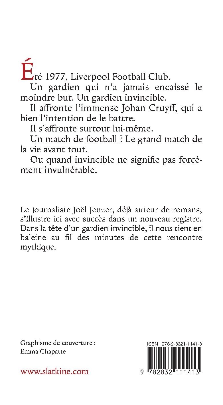 Le journaliste Joël Jenzer, déjà auteur de romans, s’illustre ici avec succès dans un nouveau registre. Dans la tête d’un gardien invincible, il nous tient en haleine au fil des minutes de cette rencontre mythique.