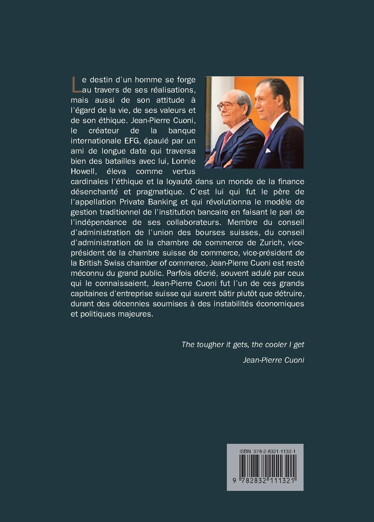 Le destin d’un homme se forge au travers de ses réalisations, mais aussi de son attitude à l’égard de la vie, de ses valeurs et de son éthique. Jean-Pierre Cuoni, le créateur de la banque internationale EFG, épaulé par un ami de longue date qui traversa bien des batailles avec lui, Lonnie Howell, éleva comme vertus cardinales l’éthique et la loyauté dans un monde de la finance désenchanté et pragmatique. C’est lui qui fut le père de l’appellation Private Banking et qui révolutionna le modèle de gestion traditionnel de l’institution bancaire en faisant le pari de l’indépendance de ses collaborateurs. Membre du conseil d’administration de l’union des bourses suisses, du conseil d’administration de la chambre de commerce de Zurich, viceprésident de la chambre suisse de commerce, vice-président de