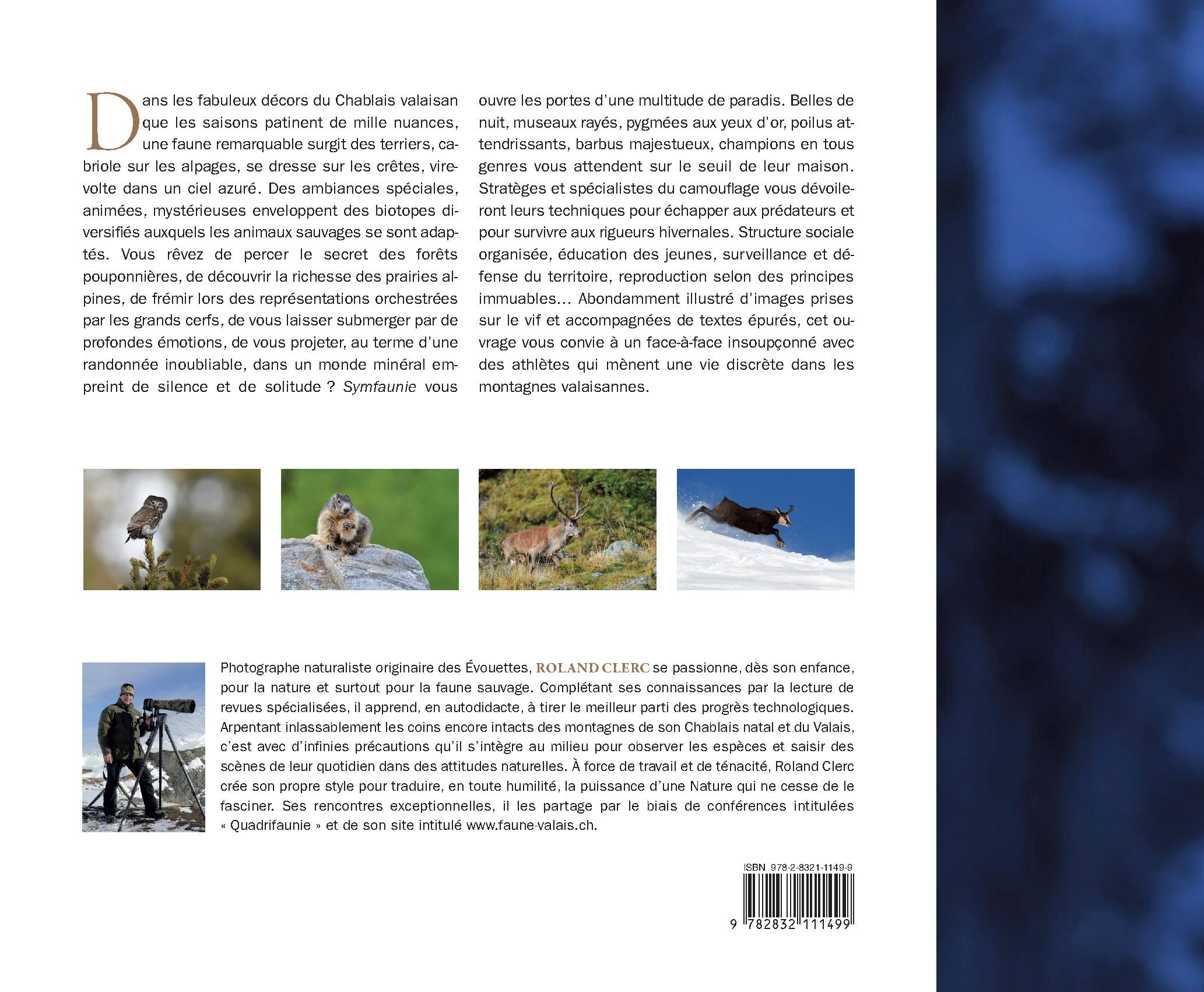 Dans les fabuleux décors du Chablais valaisan que les saisons patinent de mille nuances, une faune remarquable surgit des terriers, cabriole sur les alpages, se dresse sur les crêtes, virevolte dans un ciel azuré. Des ambiances spéciales, animées, mystérieuses enveloppent des biotopes diversifiés auxquels les animaux sauvages se sont adaptés. Vous rêvez de percer le secret des forêts pouponnières, de découvrir la richesse des prairies alpines, de frémir lors des représentations orchestrées par les grands cerfs, de vous laisser submerger par de profondes émotions, de vous projeter, au terme d’une randonnée inoubliable, dans un monde minéral empreint de silence et de solitude ? Symfaunie vous ouvre les portes d’une multitude de paradis. Belles de nuit, museaux rayés, pygmées aux yeux d’or, poilus attendrissants, barbus majestueux, champions en tous genres vous attendent sur le seuil de leur maison. Stratèges et spécialistes du camouflage vous dévoileront leurs techniques pour échapper aux prédateurs et pour survivre aux rigueurs hivernales. Structure sociale organisée, éducation des jeunes, surveillance et défense du territoire, reproduction selon des principes immuables…