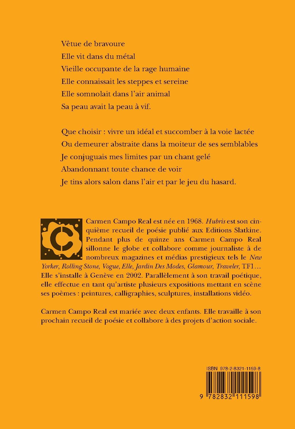 Carmen Campo Real est née en 1968. Hubris est son cinquième recueil de poésie publié aux Editions Slatkine. Pendant plus de 15 ans Carmen Campo Real sillonne le globe et collabore comme journaliste à de nombreux magazines et médias prestigieux tels : le New Yorker, Rolling Stone, Vogue, Elle, Jardin Des Modes, Glamour, Traveler, TF1... Elle s'installe à Genève en 2002. Parallèlement à son travail poétique prolifique, elle effectue en tant qu'artiste plusieurs expositions mettant en scène ses poèmes : peintures, calligraphies, sculptures, vidéo installation. Carmen Campo Real est mariée avec deux enfants. Elle travaille à son prochain recueil de poésie et collabore à des projets d'actions sociales.