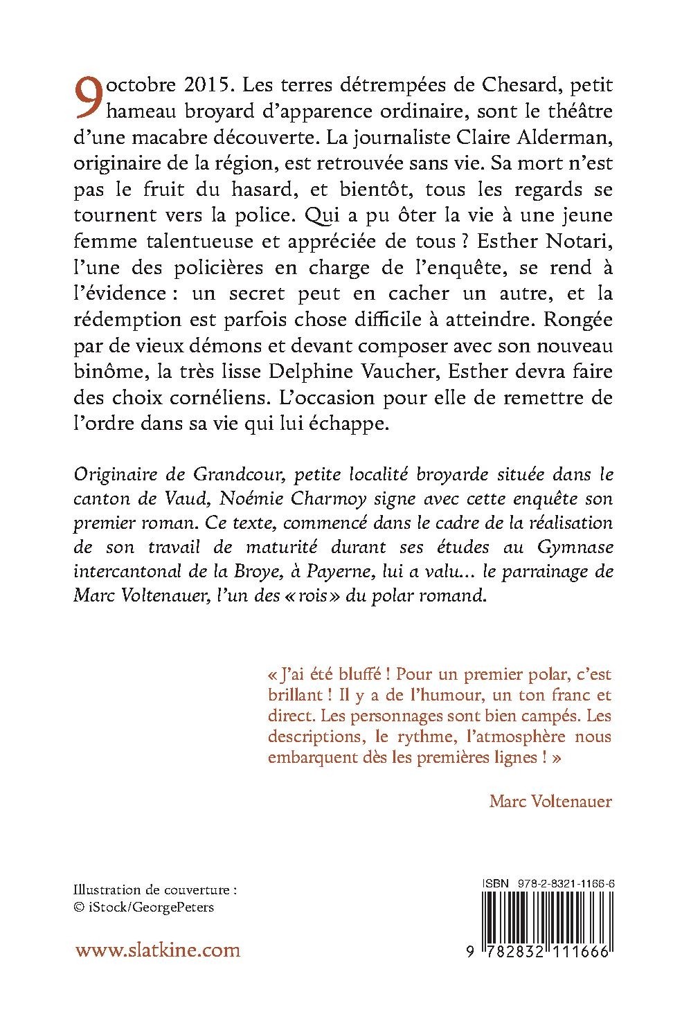 9 octobre 2015. Les terres détrempées de Chesard, petit hameau broyard d’apparence ordinaire, sont le théâtre d’une macabre découverte. La journaliste Claire Alderman, originaire de la région, est retrouvée sans vie. Sa mort n’est pas le fruit du hasard, et bientôt, tous les regards se tournent vers la police. Qui a pu ôter la vie à une jeune femme talentueuse et appréciée de tous ? Esther Notari, l’une des policières en charge de l’enquête, se rend à l’évidence : un secret peut en cacher un autre, et la rédemption est parfois chose difficile à atteindre. Rongée par de vieux démons et devant composer avec son nouveau binôme, la très lisse Delphine Vaucher, Esther devra faire des choix cornéliens. L’occasion pour elle de remettre de l’ordre dans sa vie qui lui échappe.