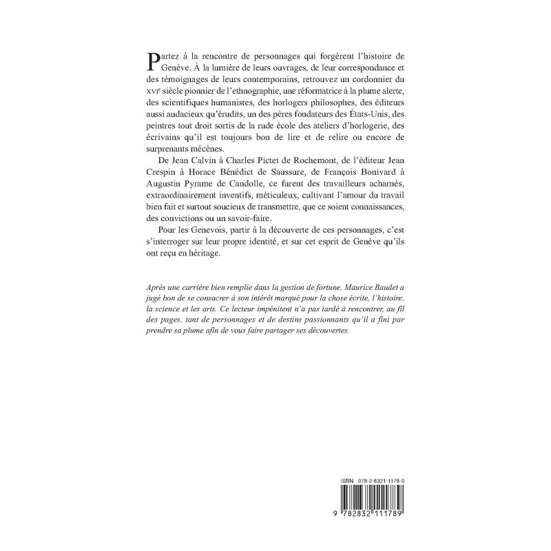 Partez à la rencontre de personnages qui forgèrent l’histoire de Genève. À la lumière de leurs ouvrages, de leur correspondance et des témoignages de leurs contemporains, retrouvez un cordonnier du XVIe siècle pionnier de l’ethnographie, une réformatrice à la plume alerte, des scientifiques humanistes, des horlogers philosophes, des éditeurs aussi audacieux qu’érudits, un des pères fondateurs des États-Unis, des peintres tout droit sortis de la rude école des ateliers d’horlogerie, des écrivains qu’il est toujours bon de lire et de relire ou encore de surprenants mécènes.