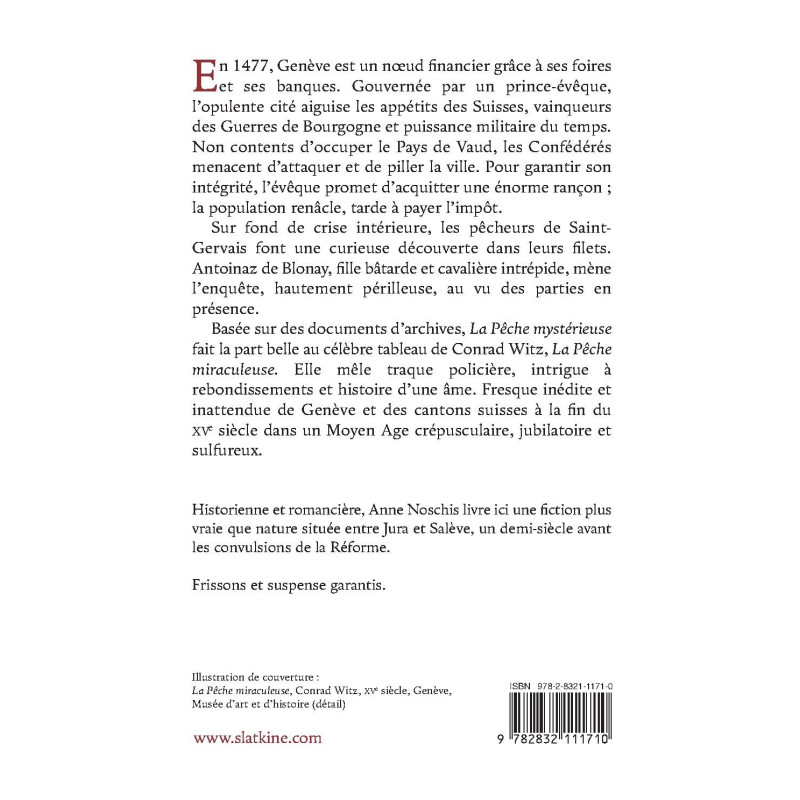 Basée sur des documents d’archives, La Pêche mystérieuse fait la part belle au célèbre tableau de Conrad Witz, La Pêche miraculeuse. Elle mêle traque policière, intrigue à rebondissements et histoire d’une âme. Fresque inédite et inattendue de Genève et des cantons suisses à la fin du XVe siècle dans un Moyen Age crépusculaire, jubilatoire et sulfureux.