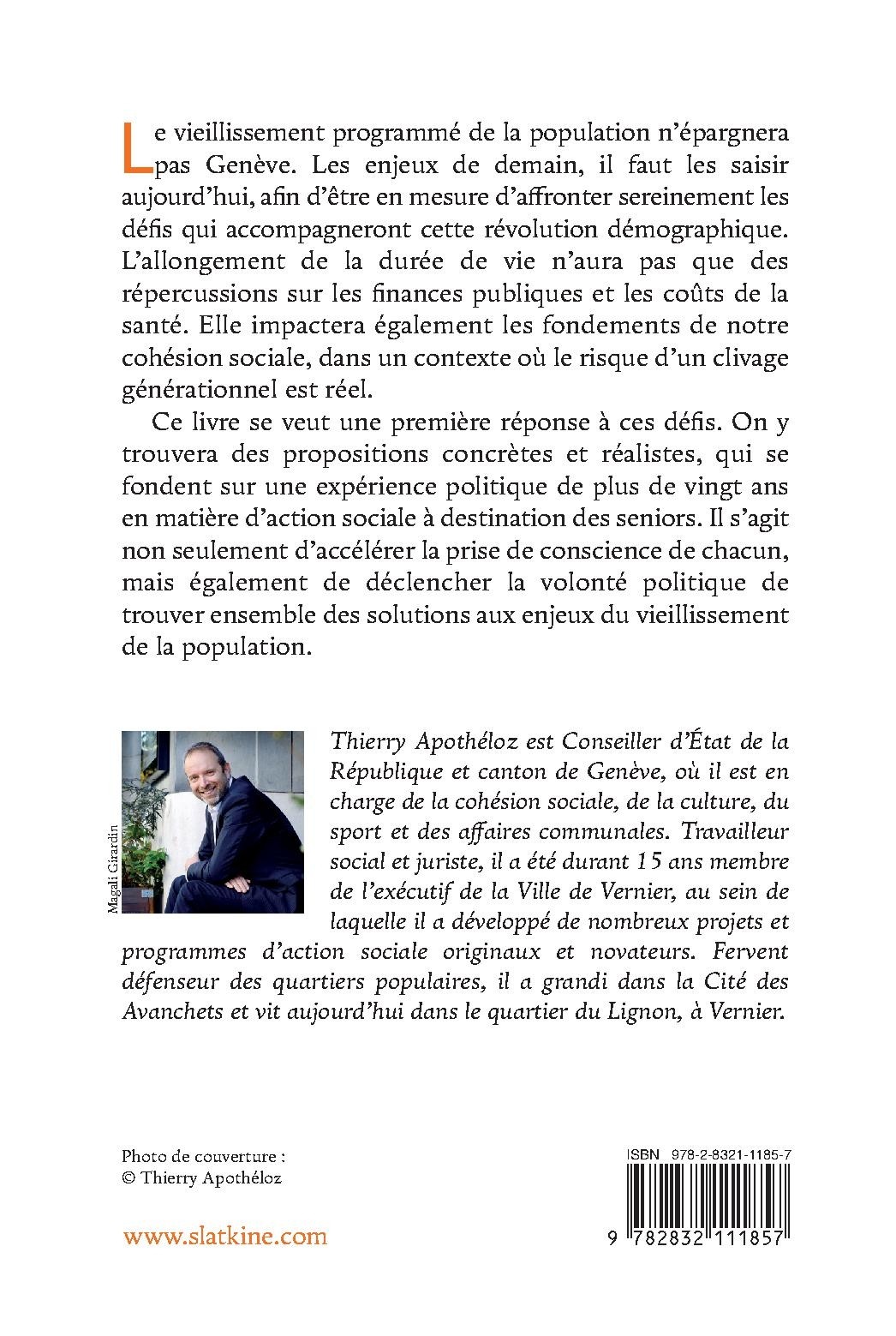 Ce livre se veut une première réponse à ces défis. On y trouvera des propositions concrètes et réalistes, qui se fondent sur une expérience politique de plus de vingt ans en matière d’action sociale à destination des seniors. Il s’agit non seulement d’accélérer la prise de conscience de chacun, mais également de déclencher la volonté politique de trouver ensemble des solutions aux enjeux du vieillissement de la population.