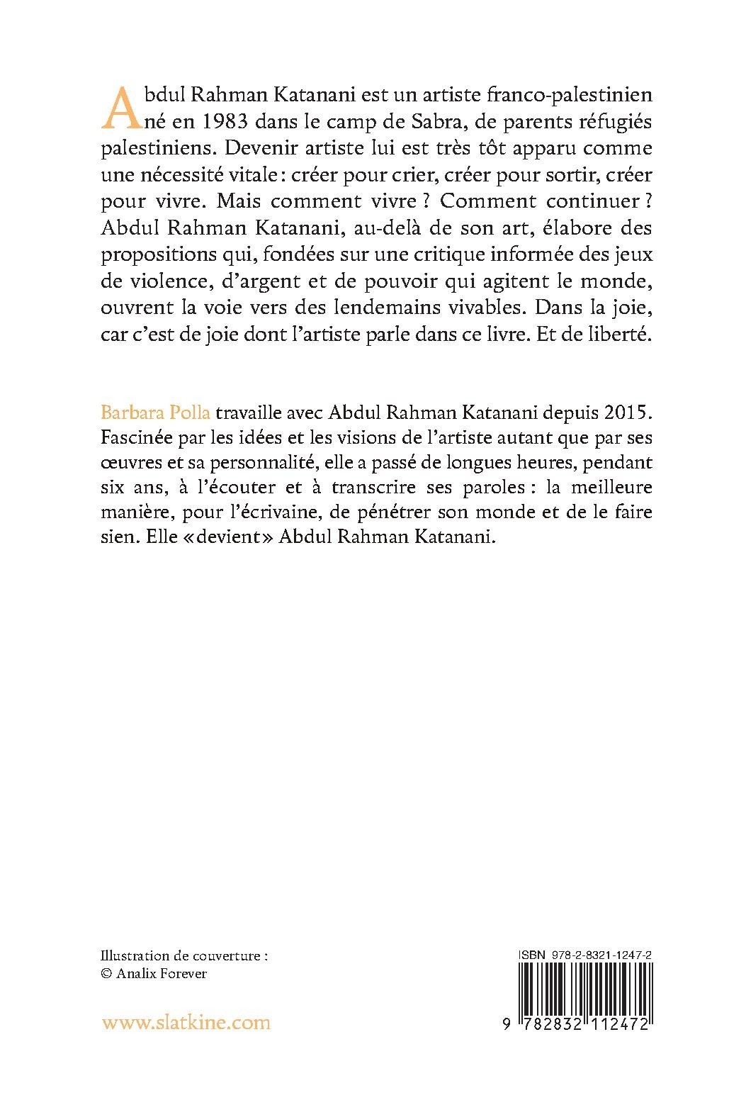 Abdul Rahman Katanani, au-delà de son art, élabore des propositions qui, fondées sur une critique informée des jeux de violence, d’argent et de pouvoir qui agitent le monde, ouvrent la voie vers des lendemains vivables. Dans la joie, car c’est de joie dont l’artiste parle dans ce livre. Et de liberté.