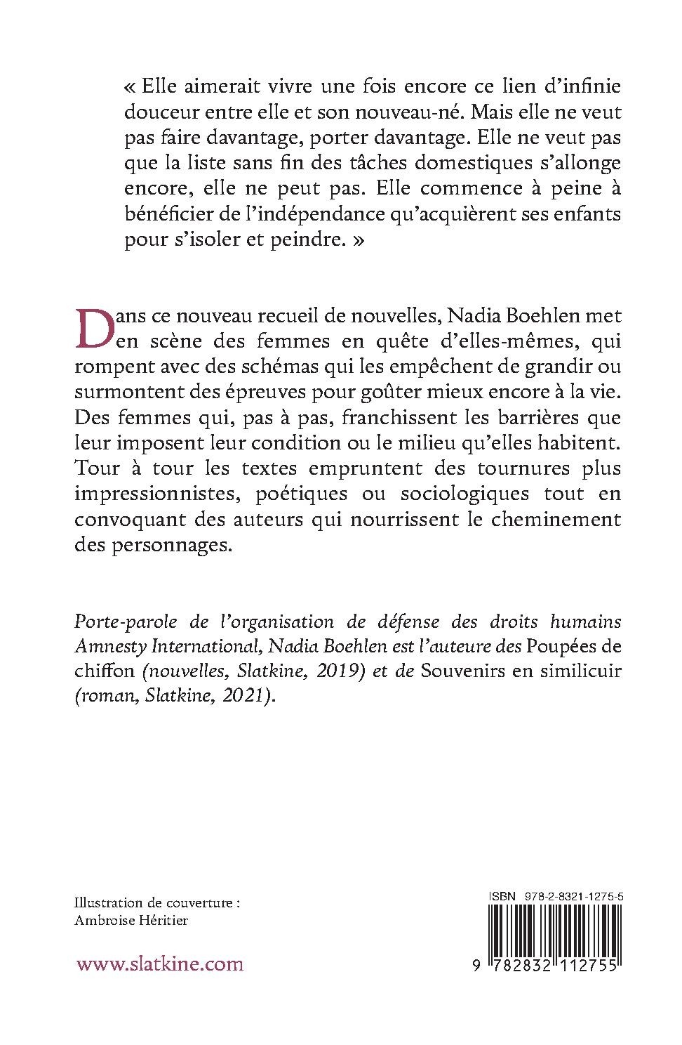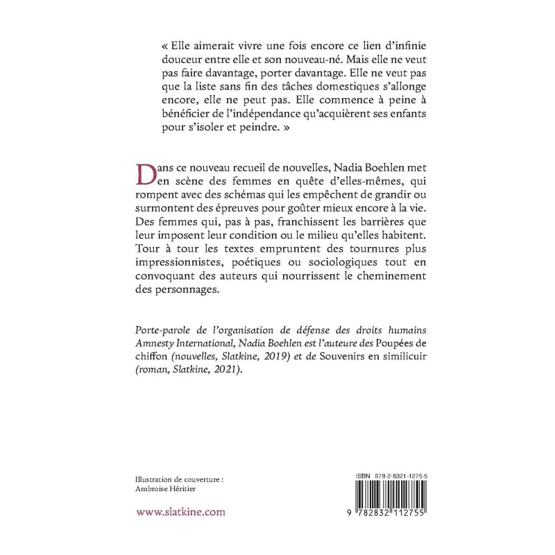 Dans ce nouveau recueil de nouvelles, Nadia Boehlen met en scène des femmes en quête d’elles-mêmes, qui rompent avec des schémas qui les empêchent de grandir ou surmontent des épreuves pour goûter mieux encore à la vie. Des femmes qui, pas à pas, franchissent les barrières que leur imposent leur condition ou le milieu qu’elles habitent. Tour à tour les textes empruntent des tournures plus impressionnistes, poétiques ou sociologiques tout en convoquant des auteurs qui nourrissent le cheminement des personnages.