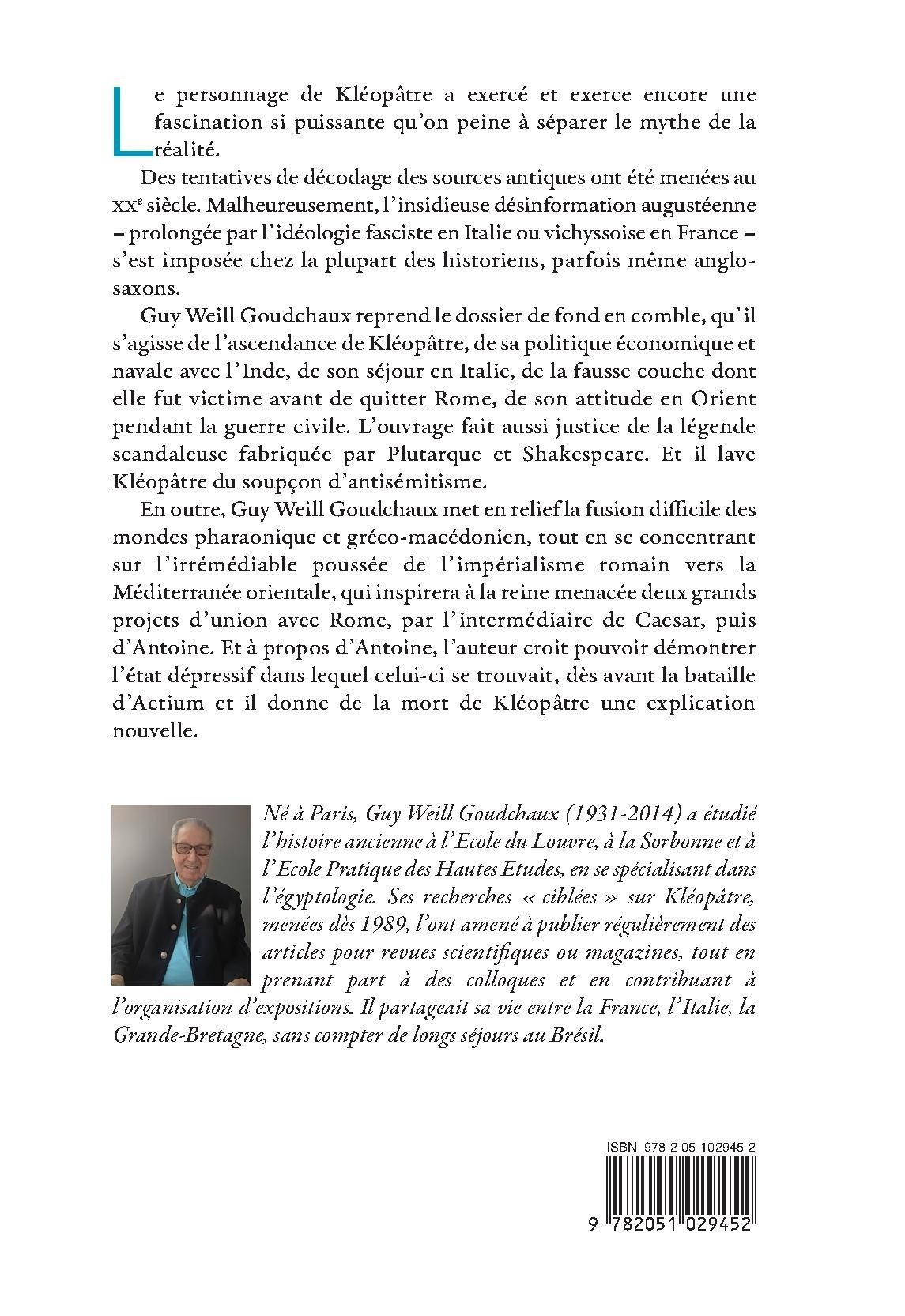 Né à Paris, Guy Weill Goudchaux (1931-2014) a étudié l’histoire ancienne à l’Ecole du Louvre, à la Sorbonne et à l’Ecole Pratique des Hautes Etudes, en se spécialisant dans l’égyptologie. Ses recherches « ciblées » sur Kléopâtre, menées dès 1989, l’ont amené à publier régulièrement des articles pour revues scientifiques ou magazines, tout en prenant part à des colloques et en contribuant à l’organisation d’expositions. Il partageait sa vie entre la France, l’Italie, la Grande-Bretagne, sans compter de longs séjours au Brésil.