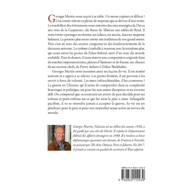 Georges Martin nous transmet aussi ses leçons de vie. Il est tombé souvent et a appris à se relever. Les portes fermées, il est parvenu à les ouvrir à force de volonté. Les murs infranchissables, il les contourne ! La guerre en Ukraine, qu’il tente de comprendre dans sa complexité historique et politique, est pour lui une amère déception et un énorme défi. On comprend que reconstruire un avenir de paix durable pour ses enfants et petit-enfants est ce qui lui tient le plus à coeur. Infatigable pacifiste, il ne se résoudra jamais à accepter la guerre. Sa vie est un plaidoyer pour la paix et pour une neutralité suisse active au service du monde.