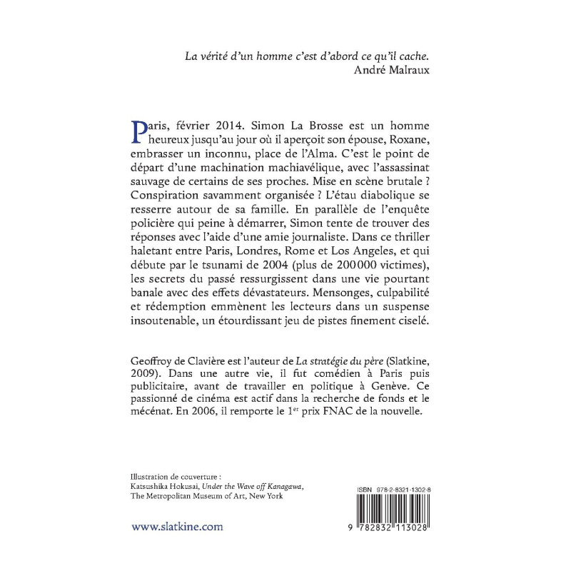 Conspiration savamment organisée ? L’étau diabolique se resserre autour de sa famille. En parallèle de l’enquête policière qui peine à démarrer, Simon tente de trouver des réponses avec l’aide d’une amie journaliste. Dans ce thriller haletant entre Paris, Londres, Rome et Los Angeles, et qui débute par le tsunami de 2004 (plus de 200 000 victimes), les secrets du passé ressurgissent dans une vie pourtant banale avec des effets dévastateurs. Mensonges, culpabilité et rédemption emmènent les lecteurs dans un suspense insoutenable, un étourdissant jeu de pistes finement ciselé.