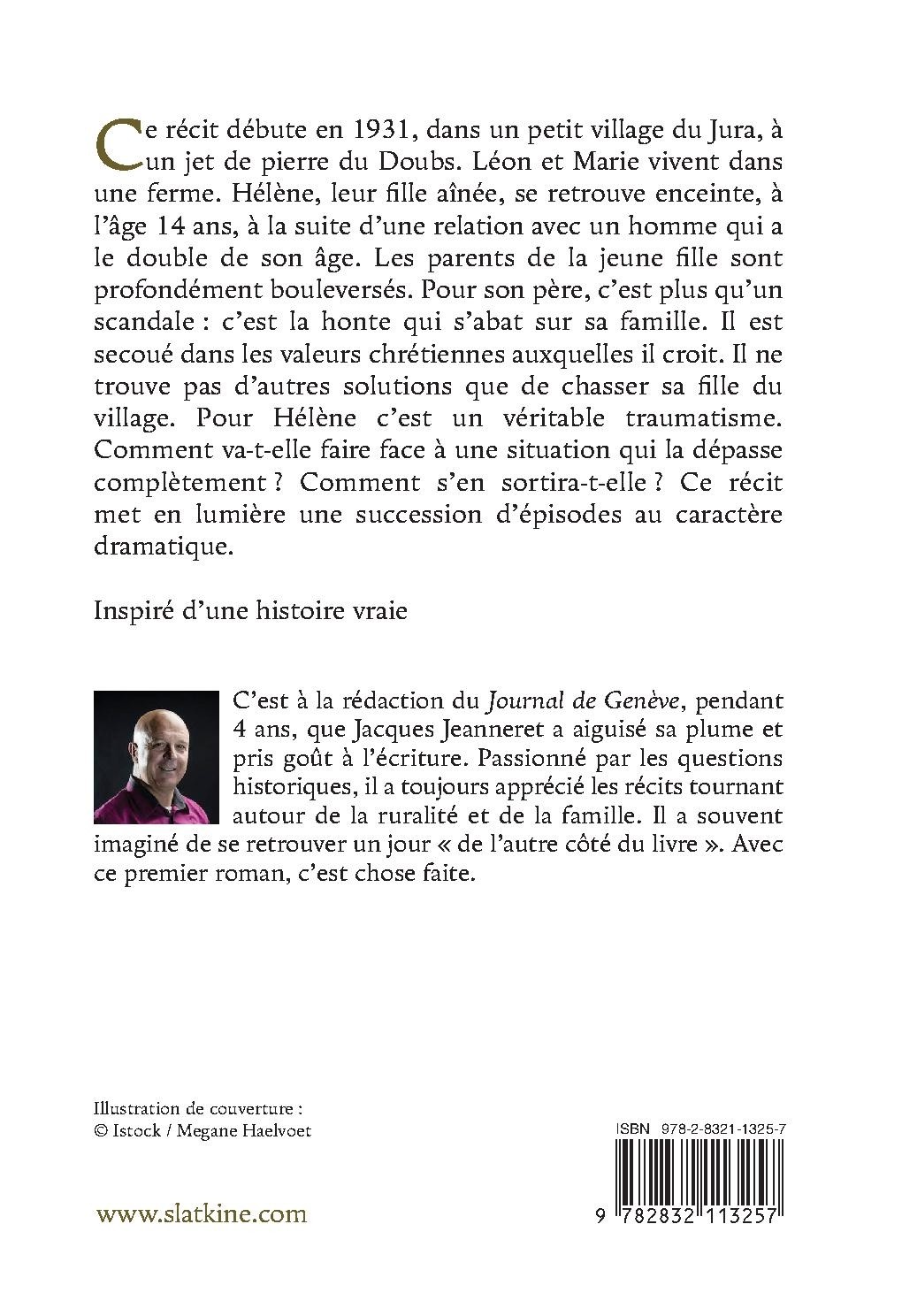 Ce récit débute en 1931, dans un petit village du Jura, à un jet de pierre du Doubs. Léon et Marie vivent dans une ferme. Hélène, leur fille aînée, se retrouve enceinte, à l’âge de 14 ans, à la suite d’une relation avec un homme qui a le double de son âge. Les parents de la jeune fille sont profondément bouleversés. Pour son père, c’est plus qu’un scandale : c’est la honte qui s’abat sur sa famille. Il est secoué dans les valeurs chrétiennes auxquelles il croit. Il ne trouve pas d’autres solutions que de chasser sa fille du village. Pour Hélène c’est un véritable traumatisme. Comment va-t-elle faire face à une situation qui la dépasse complètement ? Comment s’en sortira-t-elle ? Ce récit met en lumière une succession d’épisodes au caractère dramatique.