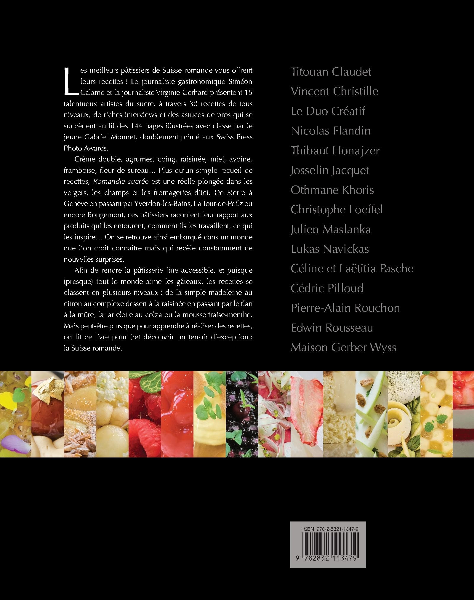 Les meilleurs pâtissiers de Suisse romande vous offrent leurs recettes ! Le journaliste gastronomique Siméon Calame et la journaliste Virginie Gerhard présentent 15 talentueux artistes du sucre, à travers 30 recettes de tous niveaux, de riches interviews et des astuces de pros qui se succèdent au fil des 144 pages illustrées avec classe par le jeune Gabriel Monnet, doublement primé aux Swiss Press Photo Awards.