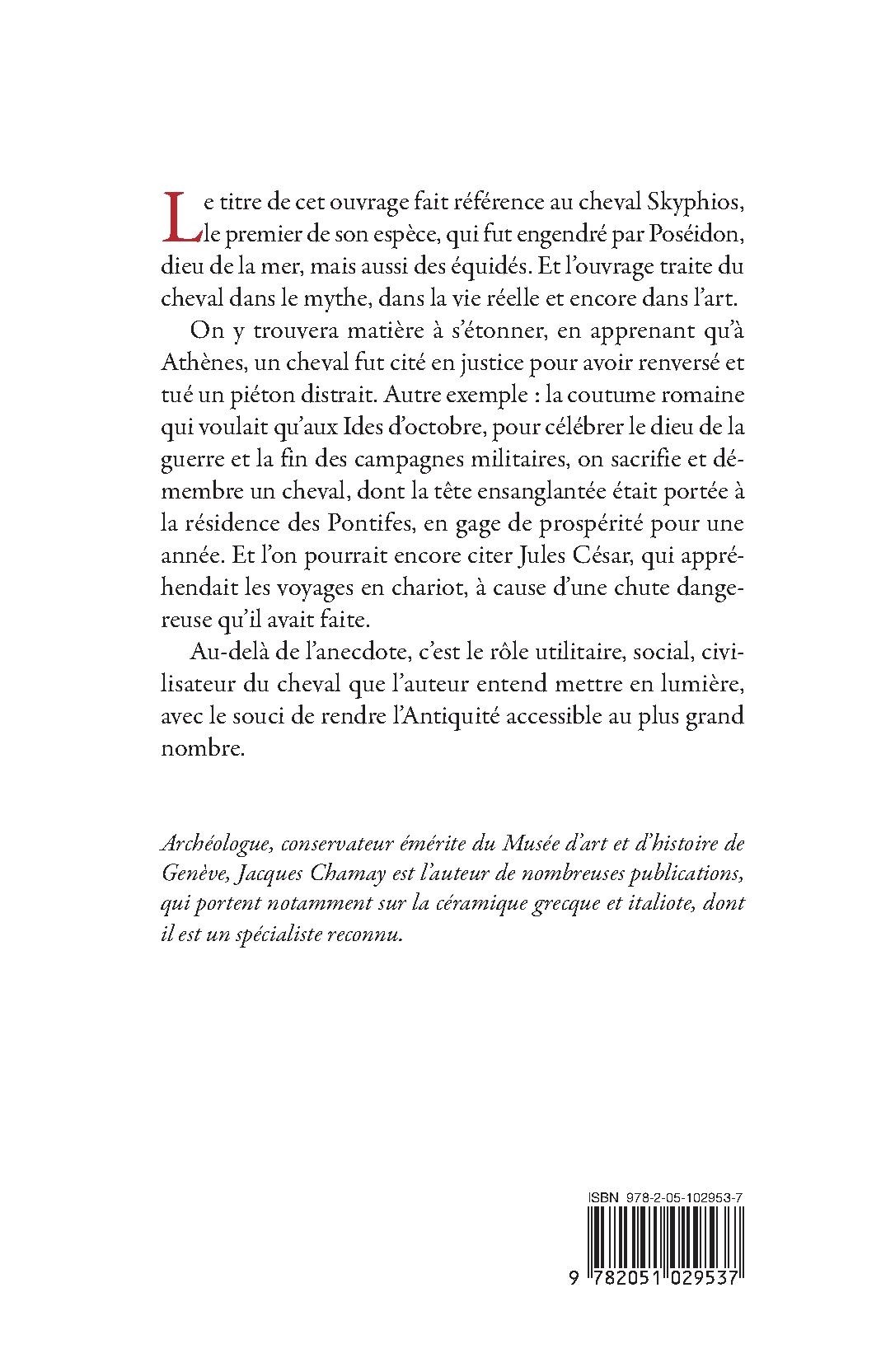 Le titre de cet ouvrage fait référence au cheval Skyphios, le premier de son espèce, qui fut engendré par Poséidon, dieu de la mer, mais aussi des équidés. Et l’ouvrage traite du cheval dans le mythe, dans la vie réelle et encore dans l’art. On y trouvera matière à s’étonner, en apprenant qu’à Athènes, un cheval fut cité en justice pour avoir renversé et tué un piéton distrait. Autre exemple : la coutume romaine qui voulait qu’aux Ides d’octobre, pour célébrer le dieu de la guerre et la fin des campagnes militaires, on sacrifie et démembre un cheval, dont la tête ensanglantée était portée à la résidence des Pontifes, en gage de prospérité pour une année. Et l’on pourrait encore citer Jules César, qui appréhendait les voyages en chariot, à cause d’une chute dangereuse qu’il avait faite.