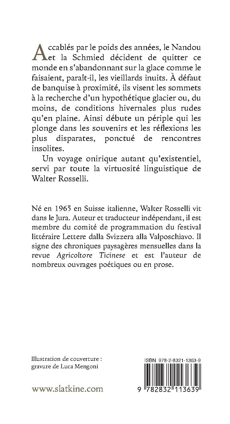 Accablés par le poids des années, le Nandou et la Schmied décident de quitter ce monde en s’abandonnant sur la glace comme le faisaient, paraît-il, les vieillards inuits. À défaut de banquise à proximité, ils visent les sommets à la recherche d’un hypothétique glacier ou, du moins, de conditions hivernales plus rudes qu’en plaine. Ainsi débute un périple qui les plonge dans les souvenirs et les réflexions les plus disparates, ponctué de rencontres insolites.