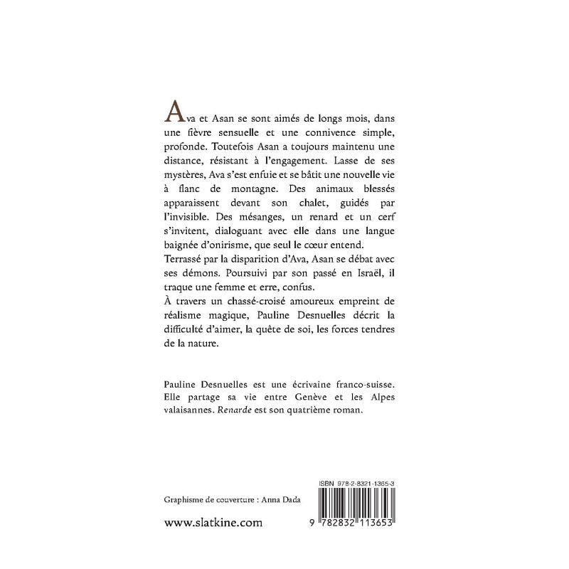 Ava et Asan se sont aimés de longs mois, dans une fièvre sensuelle et une connivence simple, profonde. Toutefois Asan a toujours maintenu une distance, résistant à l’engagement. Lasse de ses mystères, Ava s’est enfuie et se bâtit une nouvelle vie à flanc de montagne. Des animaux blessés apparaissent devant son chalet, guidés par l’invisible. Des mésanges, un renard et un cerf s’invitent, dialoguant avec elle dans une langue baignée d’onirisme, que seul le cœur entend.
