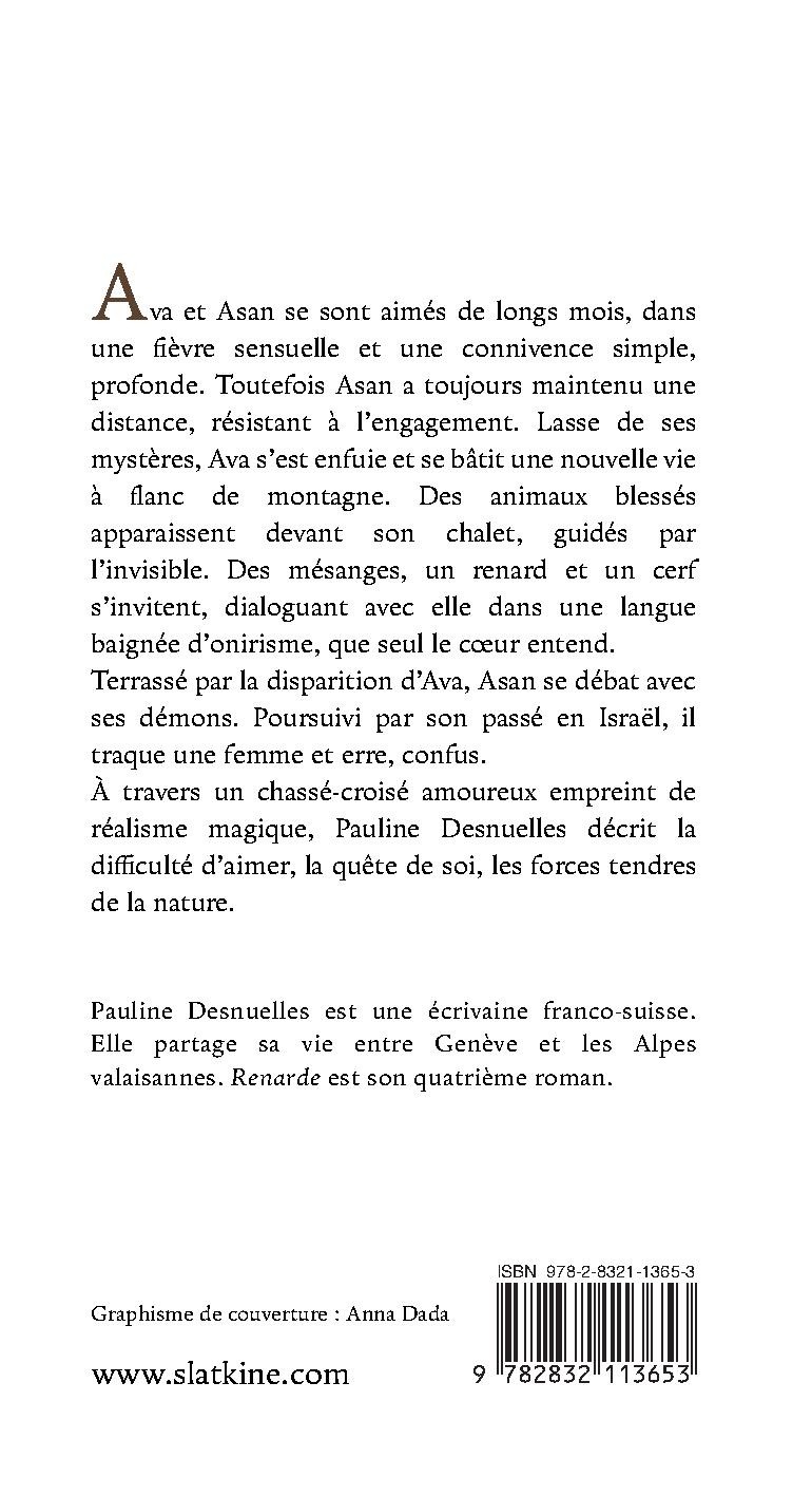 Pauline Desnuelles est une écrivaine franco-suisse. Elle partage sa vie entre Genève et les Alpes valaisannes. Renarde est son quatrième roman.