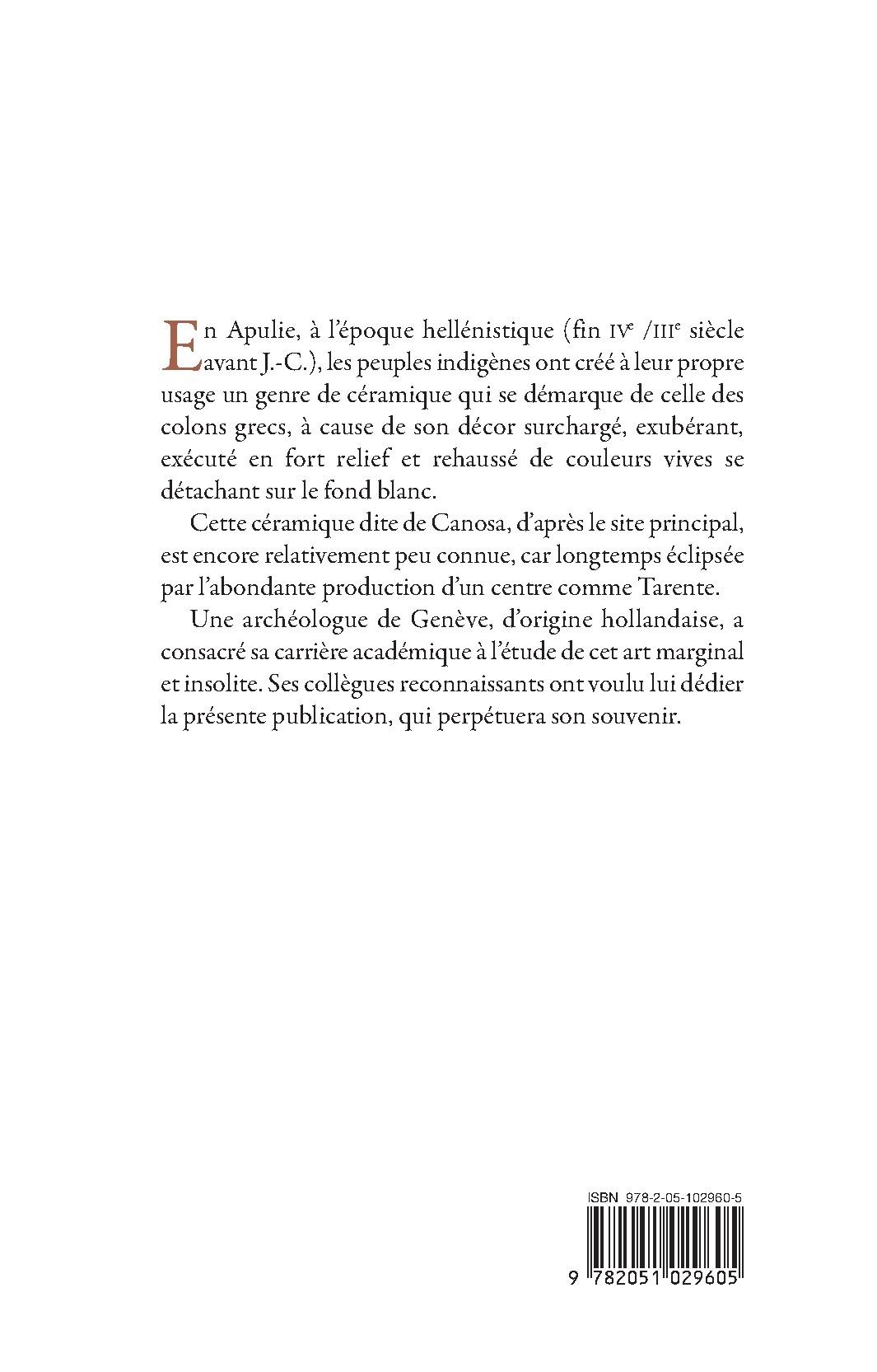 Cette céramique dite de Canosa, d’après le site principal, est encore relativement peu connue, car longtemps éclipsée par l’abondante production d’un centre comme Tarente.