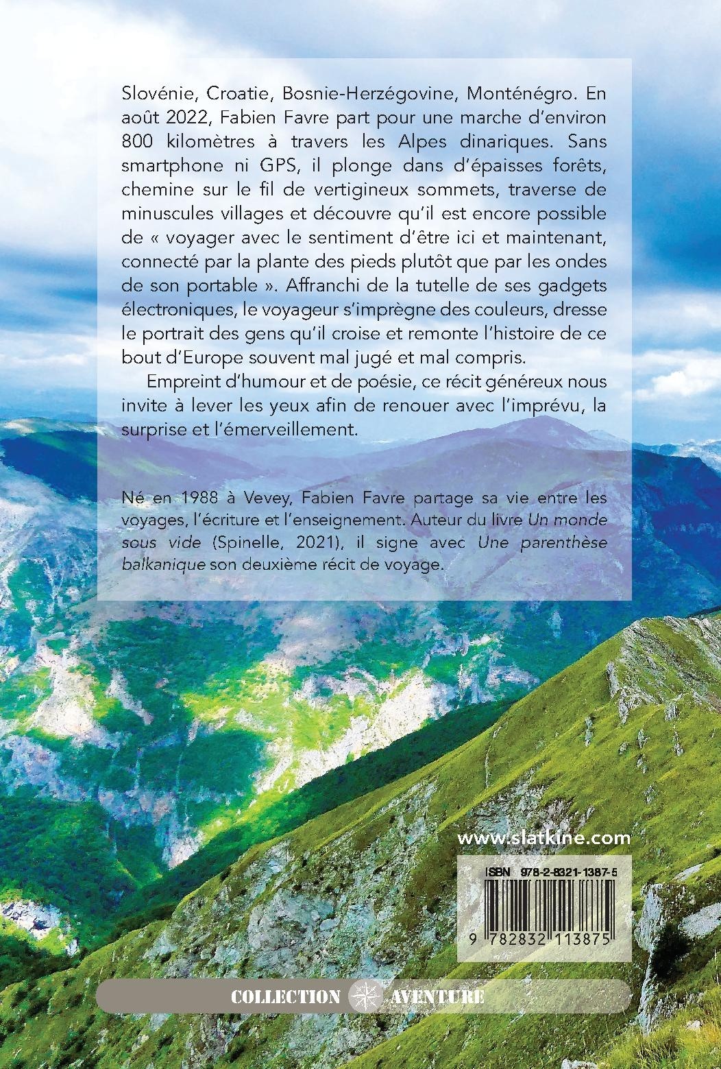 Slovénie, Croatie, Bosnie-Herzégovine, Monténégro. En août 2022, Fabien Favre part pour une marche d’environ 800 kilomètres à travers les Alpes dinariques. Sans smartphone ni GPS, il plonge dans d’épaisses forêts, chemine sur le fil de vertigineux sommets, traverse de minuscules villages et découvre qu’il est encore possible de « voyager avec le sentiment d’être ici et maintenant, connecté par la plante des pieds plutôt que par les ondes de son portable ». Affranchi de la tutelle de ses gadgets électroniques, le voyageur s’imprègne des couleurs, dresse le portrait des gens qu’il croise et remonte l’histoire de ce bout d’Europe souvent mal jugé et mal compris.