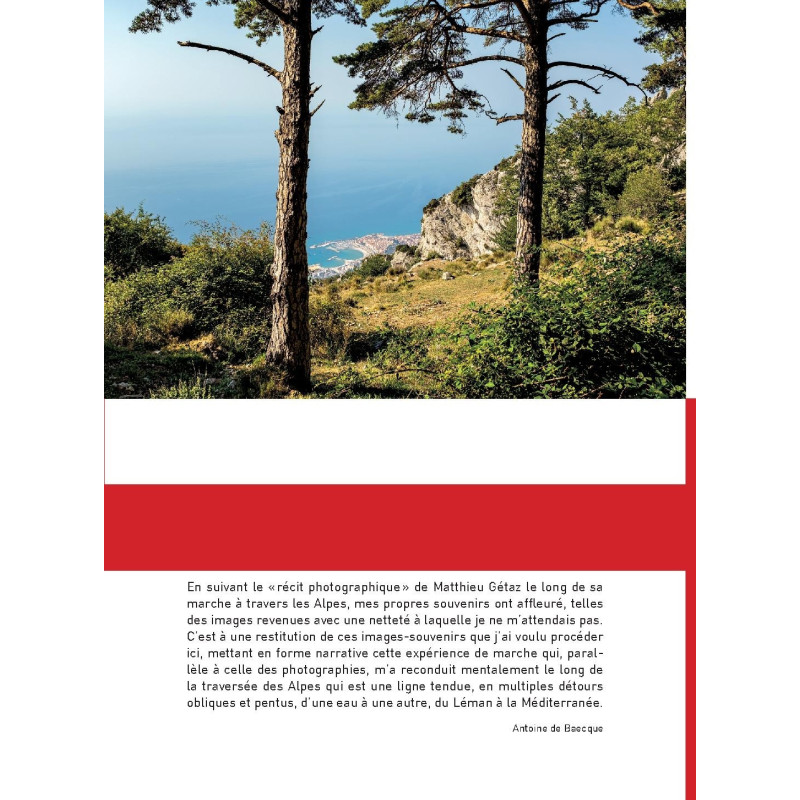 En suivant le « récit photographique » de Matthieu Gétaz le long de sa marche à travers les Alpes, mes propres souvenirs ont affleuré, telles des images revenues avec une netteté à laquelle je ne m’attendais pas. C’est à une restitution de ces images-souvenirs que j’ai voulu procéder ici, mettant en forme narrative cette expérience de marche qui, parallèle à celle des photographies, m’a reconduit mentalement le long de la traversée des Alpes qui est une ligne tendue, en multiples détours obliques et pentus, d’une eau à une autre, du Léman à la Méditerranée.