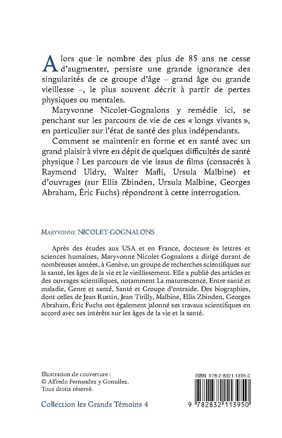 Alors que le nombre des plus de 85 ans ne cesse d’augmenter, persiste une grande ignorance des singularités de ce groupe d’âge – grand âge ou grande vieillesse –, le plus souvent décrit à partir de pertes physiques ou mentales. Maryvonne Nicolet-Gognalons y remédie ici, se penchant sur les parcours de vie de ces « longs vivants », en particulier sur l’état de santé des plus indépendants. Comment se maintenir en forme et en santé avec un grand plaisir à vivre en dépit de quelques difficultés de santé physique ? Les parcours de vie issus de films (consacrés à Raymond Uldry, Walter Mafli, Ursula Malbine) et d’ouvrages (sur Ellis Zbinden, Ursula Malbine, Georges Abraham, Éric Fuchs) répondront à cette interrogation.