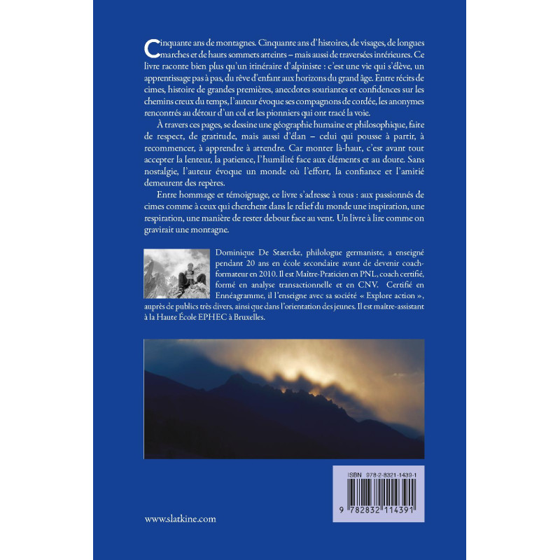 Cinquante ans de montagnes. Cinquante ans d’histoires, de visages, de longues marches et de hauts sommets atteints – mais aussi de traversées intérieures. Ce livre raconte bien plus qu’un itinéraire d’alpiniste : c’est une vie qui s’élève, un apprentissage pas à pas, du rêve d’enfant aux horizons du grand âge. Entre récits de cimes, histoire de grandes premières, anecdotes souriantes et confidences sur les chemins creux du temps, l’auteur évoque ses compagnons de cordée, les anonymes rencontrés au détour d’un col et les pionniers qui ont tracé la voie.