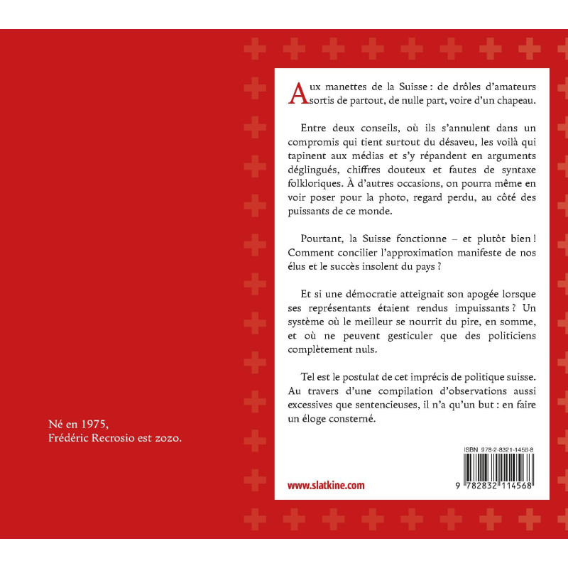 Tel est le postulat de cet imprécis de politique suisse. Au travers d’une compilation d’observations aussi excessives que sentencieuses, il n’a qu’un but : en faire un éloge consterné.