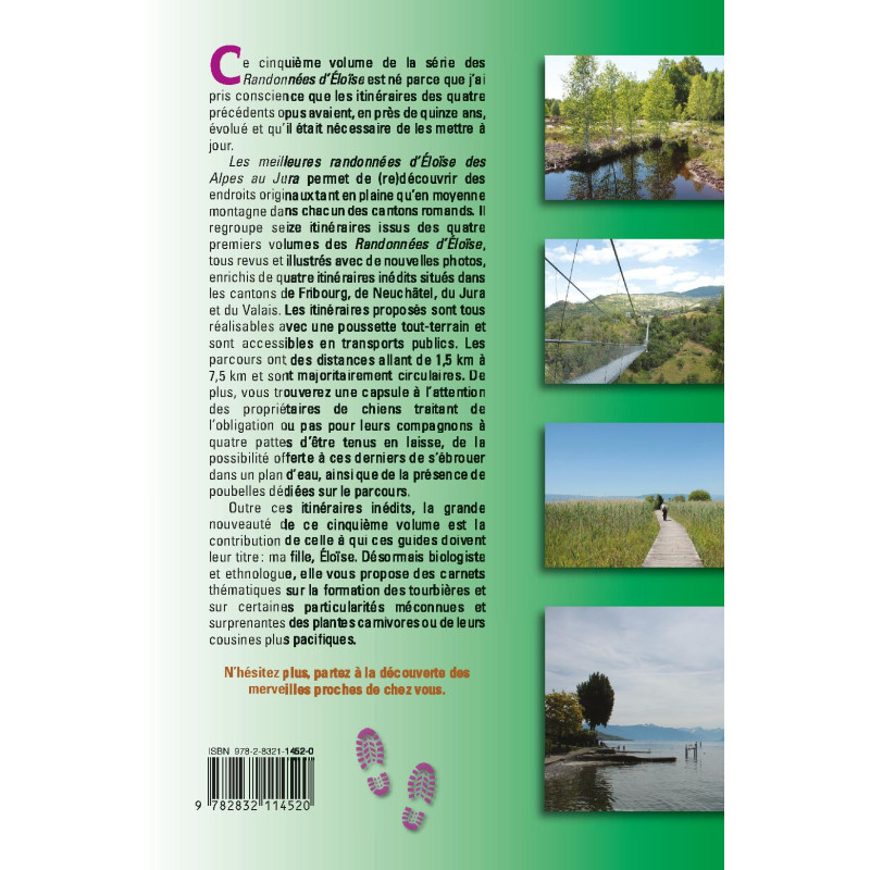 Les meilleures randonnées d’Éloïse des Alpes au Jura permet de (re)découvrir des endroits originaux tant en plaine qu’en moyenne montagne dans chacun des cantons romands. Il regroupe seize itinéraires issus des quatre premiers volumes des Randonnées d’Éloïse, tous revus et illustrés avec de nouvelles photos, enrichis de quatre itinéraires inédits situés dans les cantons de Fribourg, de Neuchâtel, du Jura et du Valais. Les itinéraires proposés sont tous réalisables avec une poussette tout-terrain et sont accessibles en transports publics. Les parcours ont des distances allant de 1,5 km à 7,5 km et sont majoritairement circulaires. De plus, vous trouverez une capsule à l’attention des propriétaires de chiens traitant de l’obligation ou pas pour leurs compagnons à quatre pattes d’être tenus en laisse, de la possibilité offerte à ces derniers de s’ébrouer dans un plan d’eau, ainsi que de la présence de poubelles dédiées sur le parcours. Outre ces itinéraires inédits, la grande nouveauté de ce cinquième volume est la contribution de celle à qui ces guides doivent leur titre : ma fille, Éloïse. Désormais biologiste et ethnologue, elle vous propose des carnets thématiques sur la formation des tourbières et sur certaines particularités méconnues et surprenantes des plantes carnivores ou de leurs cousines plus pacifiques.