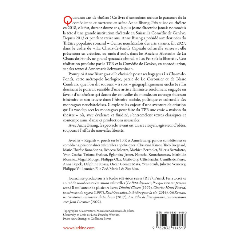 Quarante ans de théâtre ! Ce livre d’entretiens retrace le parcours de la comédienne et metteuse en scène Anne Bisang. Prix suisse du théâtre en 2018, elle fut, durant douze ans, la plus jeune directrice jamais nommée à la tête d’une grande institution théâtrale en Suisse, la Comédie de Genève. Depuis 2013 et pendant treize ans, Anne Bisang a présidé aux destinées du Théâtre populaire romand – Centre neuchâtelois des arts vivants. En 2027, dans le cadre de « La Chaux-de-Fonds Capitale culturelle suisse », elle présentera en création, au mois d’août, dans les Anciens Abattoirs de La Chaux-de-Fonds, un grand spectacle choral, « Les Feux de la liberté ». Une réalisation produite par le TPR et la Comédie de Genève, en coproduction, sur des textes d’Annemarie Schwarzenbach.