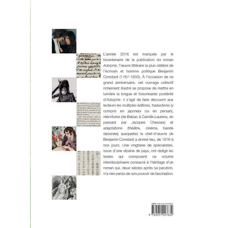 L’année 2016 est marquée par le bicentenaire de la publication du roman Adolphe, l’oeuvre littéraire la plus célèbre de l’écrivain et homme politique Benjamin Constant (1767-1830). À l’occasion de ce grand anniversaire, cet ouvrage collectif richement illustré se propose de mettre en lumière la longue et foisonnante postérité d’Adolphe : il s’agit de faire découvrir aux lecteurs les multiples éditions, traductions (y compris en japonais ou en persan), réécritures (de Balzac à Camille Laurens, en passant par Jacques Chessex) et adaptations (théâtre, cinéma, bande dessinée) auxquelles le chef-d’oeuvre de Benjamin Constant a donné lieu, de 1816 à nos jours. Une vingtaine de spécialistes, issus d’une dizaine de pays, ont rédigé les textes qui composent ce volume interdisciplinaire consacré à l’héritage d’un roman qui, deux siècles après sa parution, n’a rien perdu de son pouvoir de fascination.