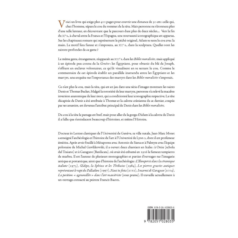 Voici un livre qui exige plus 400 pages pour couvrir une distance de 30 cm : celle qui, chez l’homme, sépare le cou du sommet de la tête. Mais personne ne s’étonnera plus d’une telle lenteur, en découvrant que le parcours dure plus de deux siècles… Vers la fin du XIe s., à cheval entre la France et l’Espagne, une nouveauté iconographique est apparue. Sur les chapiteaux romans qui représentent le péché originel, Adam se serre le cou avec la main. Le motif fera fureur et s’imposera, au XIIe s., dans la sculpture. Quelles sont les raisons profondes de ce geste ?