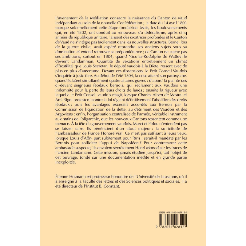 L’avènement de la Médiation consacre la naissance du Canton de Vaud indépendant au sein de la nouvelle Confédération ; la date du 14 avril 1803 marque solennellement cette étape fondatrice. Mais, les bouleversements qui, en été 1802, ont conduit au renouveau du fédéralisme, après cinq années de république unitaire, laissent des cicatrices profondes et le Canton de Vaud ne s’intègre pas facilement dans les nouvelles structures. Berne, lors de la guerre civile, avait espéré reprendre ses anciens sujets sous sa domination et entend retrouver sa prépondérance ; ce Canton ne cache pas ses ambitions, surtout en 1804, quand Nicolas-Rodolphe de Watteville devient Landamman. Quantité de vexations entretiennent un climat d’hostilité, que Louis Secretan, le député vaudois à la Diète, ressent avec de plus en plus d’amertume. Devant ces dissensions, le Petit Conseil Vaudois s’inquiète à juste titre. Au début de l’été 1804, la crise atteint son paroxysme, quand éclatent simultanément quatre affaires graves : d’abord la plainte des ci-devant seigneurs féodaux bernois, qui réclament aux Vaudois une indemnité pour la perte de leurs droits de lauds ; ensuite la rigueur avec laquelle le Petit Conseil vaudois réagit, lorsque Charles-Albert de Mestral et Ami Rigot protestent contre la loi réglant définitivement l’abolition des droits féodaux ; puis les avantages excessifs accordés aux Bernois par la Commission de liquidation de la dette, au détriment des Vaudois et des Argoviens ; enfin, l’organisation centralisée de l’armée, véritable instrument aux mains de l’oligarchie, que les nouveaux Cantons ressentent comme une menace. À la tête du gouvernement vaudois, Muret et Pidou n’entendent pas se laisser faire. Ils bénéficient d’un atout majeur : la sollicitude de l’ambassadeur de France Honoré Vial. Ce n’est pas suffisant à leurs yeux, lorsque Louis d’Affry part subitement pour Paris ; serait-il mandaté par les Bernois pour solliciter l’appui de Napoléon ? Pour contrecarrer cette ambassade suspecte, ils envoient secrètement Henri Monod sur les traces de l’ancien Landamann. Cette mission, jamais étudiée jusqu’ici, fait l’objet de cet ouvrage, fondé sur une documentation inédite et en grande partie inexploitée.
