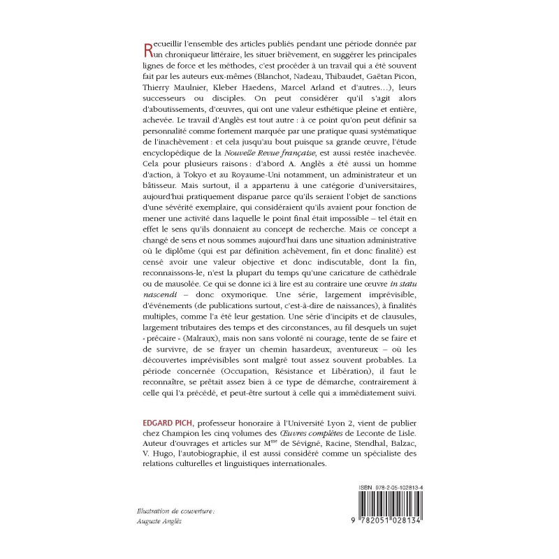 Recueillir l’ensemble des articles publiés pendant une période donnée par un chroniqueur littéraire, les situer brièvement, en suggérer les principales lignes de force et les méthodes, c’est procéder à un travail qui a été souvent fait par les auteurs eux-mêmes (Blanchot, Nadeau, Thibaudet, Gaëtan Picon, Thierry Maulnier, Kleber Haedens, Marcel Arland et d’autres…), leurs successeurs ou disciples. On peut considérer qu’il s’agit alors d’aboutissements, d’œuvres, qui ont une valeur esthétique pleine et entière, achevée. Le travail d’Anglès est tout autre : à ce point qu’on peut définir sa personnalité comme fortement marquée par une pratique quasi systématique de l’inachèvement : et cela jusqu’au bout puisque sa grande oeuvre, l’étude encyclopédique de la Nouvelle Revue française, est aussi restée inachevée. Cela pour plusieurs raisons : d’abord A. Anglès a été aussi un homme d’action, à Tokyo et au Royaume-Uni notamment, un administrateur et un bâtisseur. Mais surtout, il a appartenu à une catégorie d’universitaires, aujourd’hui pratiquement disparue parce qu’ils seraient l’objet de sanctions d’une sévérité exemplaire, qui considéraient qu’ils avaient pour fonction de mener une activité dans laquelle le point final était impossible – tel était en effet le sens qu’ils donnaient au concept de recherche. Mais ce concept a changé de sens et nous sommes aujourd’hui dans une situation administrative où le diplôme (qui est par définition achèvement, fin et donc finalité) est censé avoir une valeur objective et donc indiscutable, dont la fin, reconnaissons-le, n’est la plupart du temps qu’une caricature de cathédrale ou de mausolée. Ce qui se donne ici à lire est au contraire une oeuvre in statu nascendi – donc oxymorique. Une série, largement imprévisible, d’événements (de publications surtout, c’est-à-dire de naissances), à finalités multiples, comme l’a été leur gestation. Une série d’incipits et de clausules, largement tributaires des temps et des circonstances, au fil desquels un sujet « précaire » (Malraux), mais non sans volonté ni courage, tente de se faire et de survivre, de se frayer un chemin hasardeux, aventureux – où les découvertes imprévisibles sont malgré tout assez souvent probables. La période concernée (Occupation, Résistance et Libération), il faut le reconnaître, se prêtait assez bien à ce type de démarche, contrairement à celle qui l’a précédé, et peut-être surtout à celle qui a immédiatement suivi.