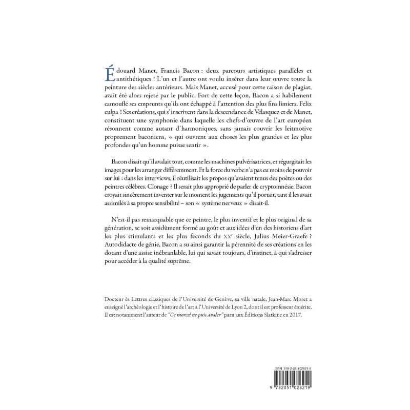 Édouard Manet, Francis Bacon : deux parcours artistiques parallèles et antithétiques ! L’un et l’autre ont voulu insérer dans leur oeuvre toute la peinture des siècles antérieurs. Mais Manet, accusé pour cette raison de plagiat, avait été alors rejeté par le public. Fort de cette leçon, Bacon a si habilement camouflé ses emprunts qu’ils ont échappé à l’attention des plus fins limiers. Felix culpa ! Ses créations, qui s’inscrivent dans la descendance de Vélasquez et de Manet, constituent une symphonie dans laquelle les chefs-d’oeuvre de l’art européen résonnent comme autant d’harmoniques, sans jamais couvrir les leitmotive proprement baconiens, « qui ouvrent aux choses les plus grandes et les plus profondes qu’un homme puisse sentir ».