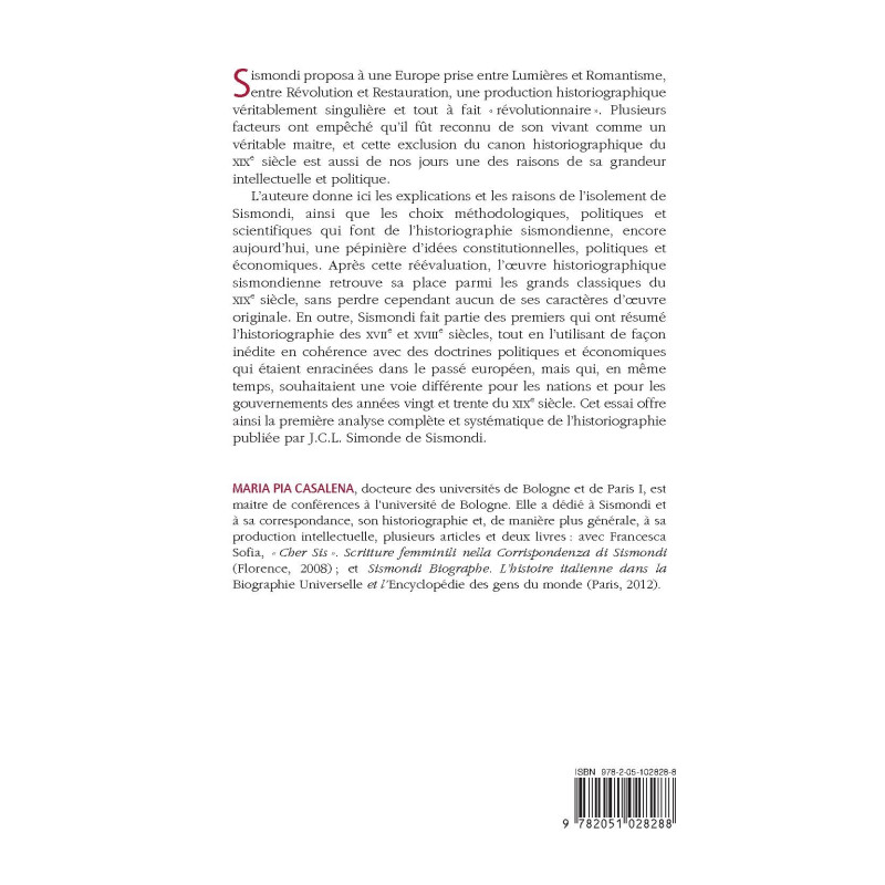 MARIA PIA CASALENA, docteure des universités de Bologne et de Paris I, est maitre de conférences à l’université de Bologne. Elle a dédié à Sismondi et à sa correspondance, son historiographie et, de manière plus générale, à sa production intellectuelle, plusieurs articles et deux livres : avec Francesca Sofia, « Cher Sis ». Scritture femminili nella Corrispondenza di Sismondi (Florence, 2008) ; et Sismondi Biographe. L’histoire italienne dans la Biographie Universelle et l’Encyclopédie des gens du monde (Paris, 2012).