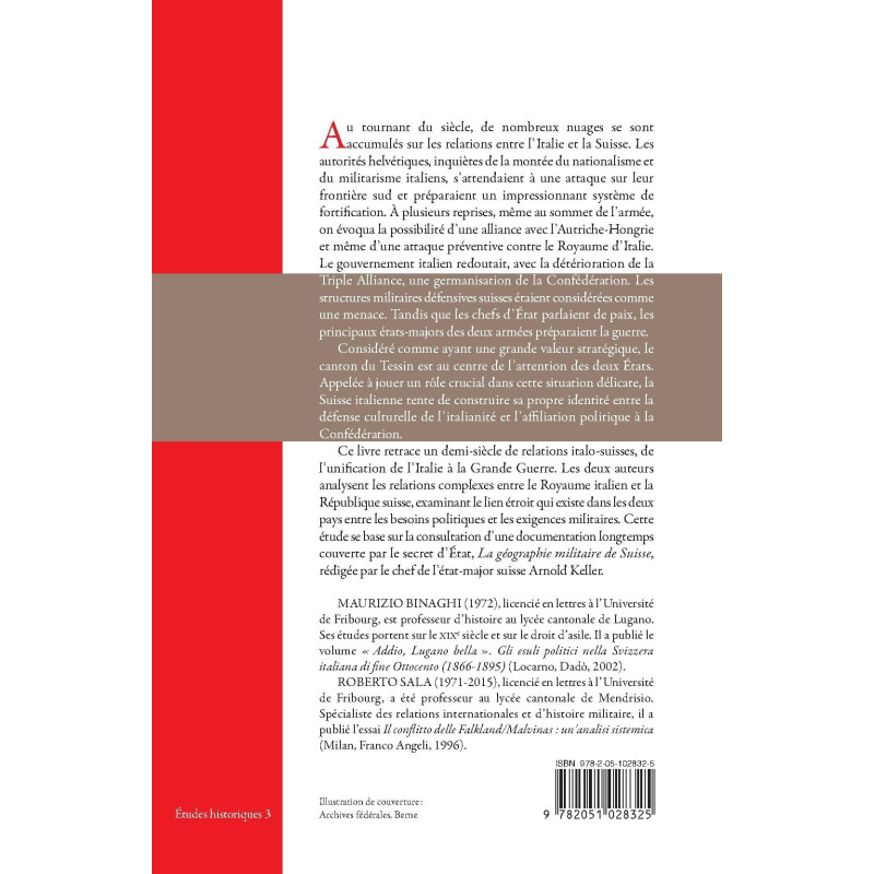 Ce livre retrace un demi-siècle de relations italo-suisses, de l’unification de l’Italie à la Grande Guerre. Les deux auteurs analysent les relations complexes entre le Royaume italien et la République suisse, examinant le lien étroit qui existe dans les deux pays entre les besoins politiques et les exigences militaires. Cette étude se base sur la consultation d’une documentation longtemps couverte par le secret d’État, La géographie militaire de Suisse, rédigée par le chef de l’état-major suisse Arnold Keller.