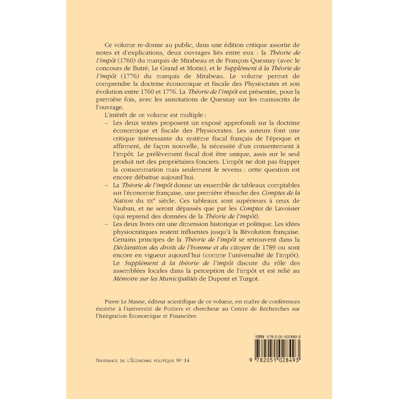 Ce volume re-donne au public, dans une édition critique assortie de notes et d’explications, deux ouvrages liés entre eux : la Théorie de l’impôt (1760) du marquis de Mirabeau et de François Quesnay (avec le concours de Butré, Le Grand et Morin), et le Supplément à la Théorie de l’impôt (1776) du marquis de Mirabeau. Le volume permet de comprendre la doctrine économique et fiscale des Physiocrates et son évolution entre 1760 et 1776. La Théorie de l’impôt est présentée, pour la première fois, avec les annotations de Quesnay sur les manuscrits de l’ouvrage.