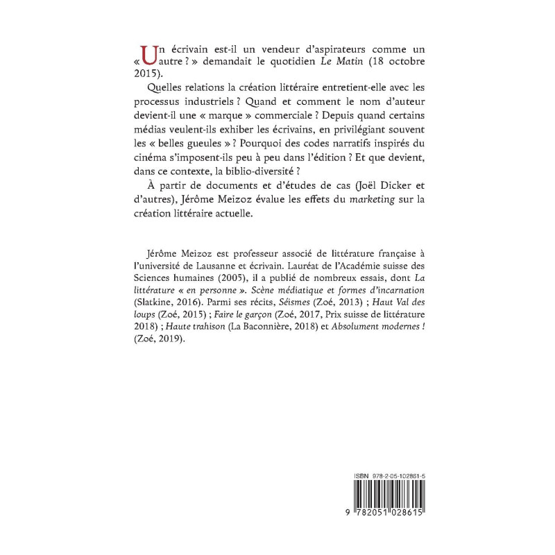 Quelles relations la création littéraire entretient-elle avec les processus industriels ? Quand et comment le nom d’auteur devient-il une « marque » commerciale ? Depuis quand certains médias veulent-ils exhiber les écrivains, en privilégiant souvent les « belles gueules » ? Pourquoi des codes narratifs inspirés du cinéma s’imposent-ils peu à peu dans l’édition ? Et que devient, dans ce contexte, la biblio-diversité ?