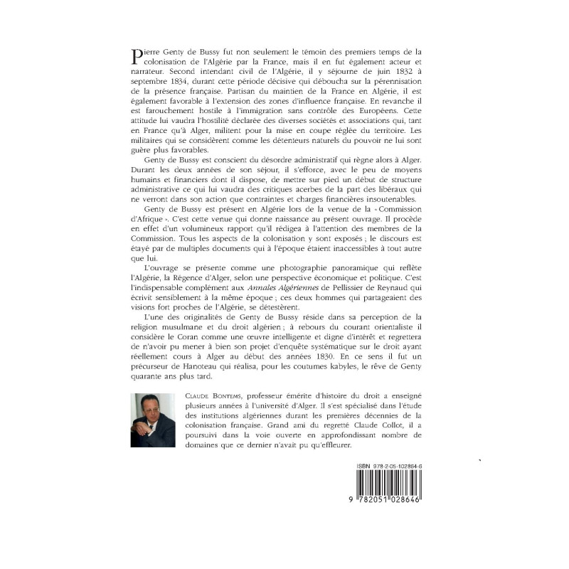 Pierre Genty de Bussy fut non seulement le témoin des premiers temps de la colonisation de l’Algérie par la France, mais il en fut également acteur et narrateur. Second intendant civil de l’Algérie, il y séjourne de juin 1832 à septembre 1834, durant cette période décisive qui déboucha sur la pérennisation de la présence française. Partisan du maintien de la France en Algérie, il est également favorable à l’extension des zones d’influence française. En revanche il est farouchement hostile à l’immigration sans contrôle des Européens. Cette attitude lui vaudra l’hostilité déclarée des diverses sociétés et associations qui, tant en France qu’à Alger, militent pour la mise en coupe réglée du territoire. Les militaires qui se considèrent comme les détenteurs naturels du pouvoir ne lui sont guère plus favorables.