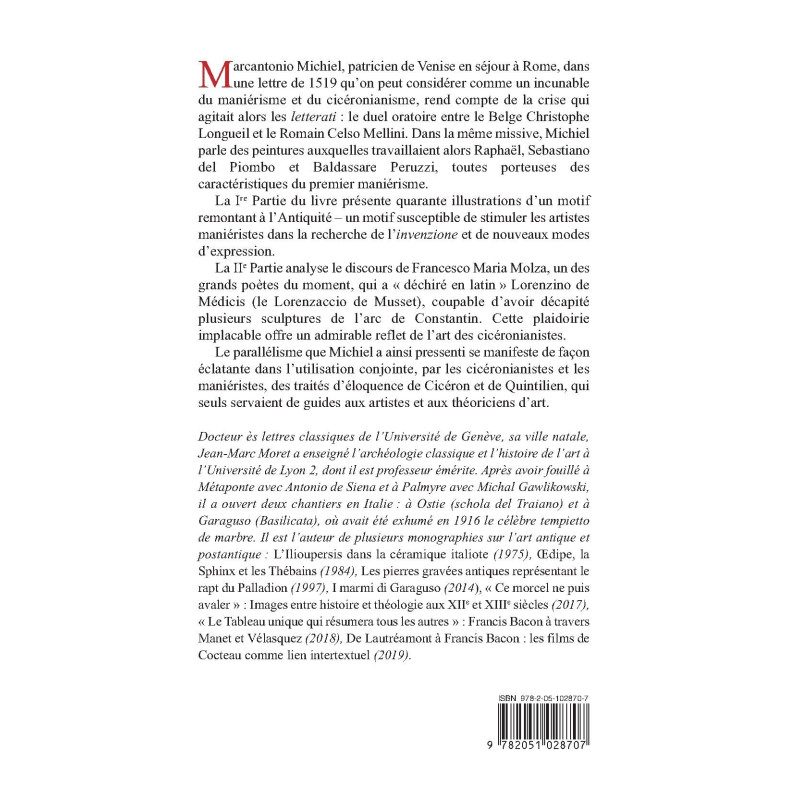 Docteur ès lettres classiques de l’Université de Genève, sa ville natale, Jean-Marc Moret a enseigné l’archéologie classique et l’histoire de l’art à l’Université de Lyon 2, dont il est professeur émérite. Après avoir fouillé à Métaponte avec Antonio de Siena et à Palmyre avec Michal Gawlikowski, il a ouvert deux chantiers en Italie : à Ostie (schola del Traiano) et à Garaguso (Basilicata), où avait été exhumé en 1916 le célèbre tempietto de marbre. Il est l’auteur de plusieurs monographies sur l’art antique et postantique : L’Ilioupersis dans la céramique italiote (1975), Œdipe, la Sphinx et les Thébains (1984), Les pierres gravées antiques représentant le rapt du Palladion (1997), I marmi di Garaguso (2014), « Ce morcel ne puis avaler » : Images entre histoire et théologie aux XIIe et XIIIe siècles (2017), « Le Tableau unique qui résumera tous les autres » : Francis Bacon à travers Manet et Vélasquez (2018), De Lautréamont à Francis Bacon : les films de Cocteau comme lien intertextuel (2019).