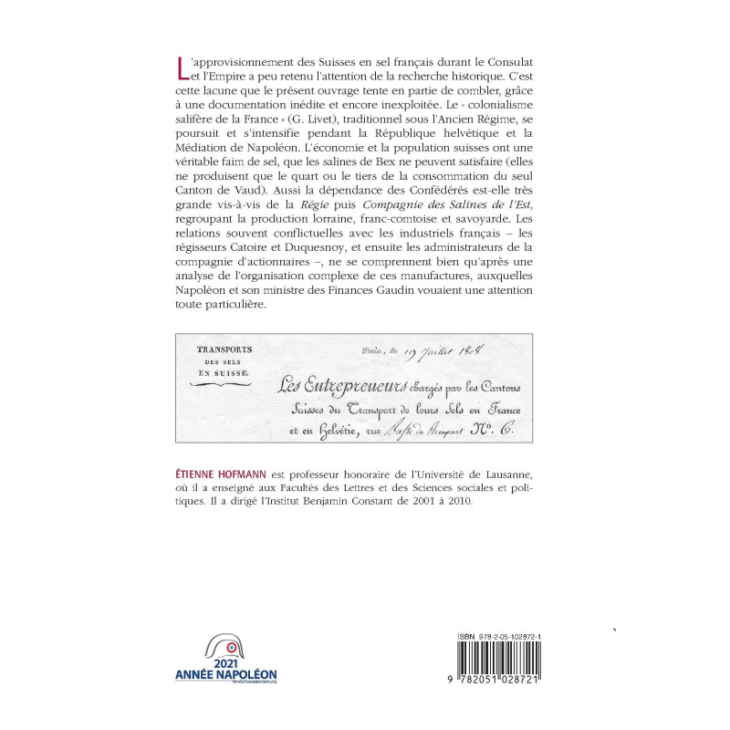 L’approvisionnement des Suisses en sel français durant le Consulat et l’Empire a peu retenu l’attention de la recherche historique. C’est cette lacune que le présent ouvrage tente en partie de combler, grâce à une documentation inédite et encore inexploitée. Le « colonialisme salifère de la France » (G. Livet), traditionnel sous l’Ancien Régime, se poursuit et s’intensifie pendant la République helvétique et la Médiation de Napoléon. L’économie et la population suisses ont une véritable faim de sel, que les salines de Bex ne peuvent satisfaire (elles ne produisent que le quart ou le tiers de la consommation du seul Canton de Vaud). Aussi la dépendance des Confédérés est-elle très grande vis-à-vis de la Régie puis Compagnie des Salines de l’Est, regroupant la production lorraine, franc-comtoise et savoyarde. Les relations souvent conflictuelles avec les industriels français – les régisseurs Catoire et Duquesnoy, et ensuite les administrateurs de la compagnie d’actionnaires –, ne se comprennent bien qu’après une analyse de l’organisation complexe de ces manufactures, auxquelles Napoléon et son ministre des Finances Gaudin vouaient une attention toute particulière.