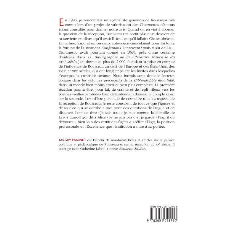 En 1986, je rencontrais un spécialiste genevois de Rousseau très connu lors d’un projet de valorisation des Charmettes où nous étions consultés pour donner notre avis. Quand on en vint à aborder la question de la réception, l’universitaire sortit plusieurs dossiers de sa serviette en disant qu’il avait là tout ce qu’il fallait : Chateaubriand, Lamartine, Sand et un ou deux autres écrivains étaient pour lui toute la fortune de l’auteur des Confessions. L’innocent ! mais si sûr de lui… Cioranescu avait pourtant donné en 1969, près d’une centaine d’entrées dans sa Bibliographie de la littérature française du XVIIIe siècle. J’en donne ici plus de 2 000, étendant la prise en compte de l’influence de Rousseau au-delà de l’Europe et des États-Unis, des XVIIIe et XIXe siècles, qui ont longtemps été les limites dans lesquelles s’exerçait la curiosité savante. Nous introduisons donc le lecteur, comme dans les volumes précédents de la Bibliographie mondiale, dans un monde bien moins étroit et bien plus complexe. La première réaction pourra être, pour lui, de crainte et de repli frileux vers les bonnes vieilles certitudes bien délimitées et admises. Je compte donc sur la seconde. Loin d’être persuadé de connaître tous les aspects de la réception de Rousseau, je reste conscient de tout ce que j’ignore et de tout ce qui se dérobe à moi pour des questions de langue et de distance. Loin de dire « Je sais tout », je suis comme la chenille de Lewis Carroll qui dit à Alice « Je ne sais pas », et je garde « l’esprit du débutant », bien loin des certitudes figées qu’offrent l’âge, la position professorale et l’Excellence que l’institution a mise à sa portée.