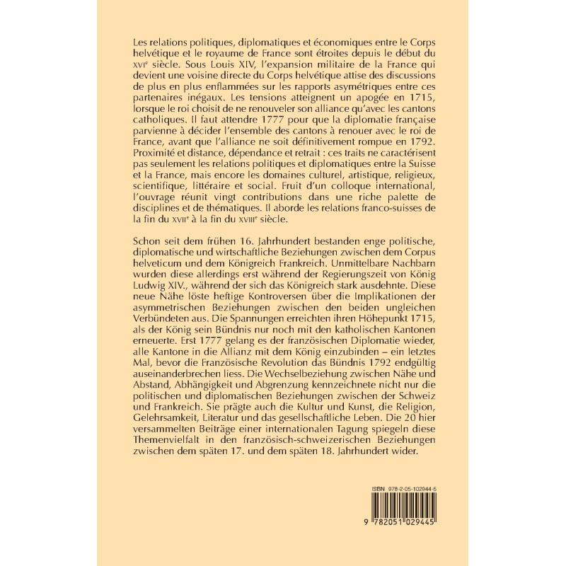 Les relations politiques, diplomatiques et économiques entre le Corps helvétique et le royaume de France sont étroites depuis le début du XVIe siècle. Sous Louis XIV, l’expansion militaire de la France qui devient une voisine directe du Corps helvétique attise des discussions de plus en plus enflammées sur les rapports asymétriques entre ces partenaires inégaux. Les tensions atteignent un apogée en 1715, lorsque le roi choisit de ne renouveler son alliance qu’avec les cantons catholiques. Il faut attendre 1777 pour que la diplomatie française parvienne à décider l’ensemble des cantons à renouer avec le roi de France, avant que l’alliance ne soit définitivement rompue en 1792. Proximité et distance, dépendance et retrait : ces traits ne caractérisent pas seulement les relations politiques et diplomatiques entre la Suisse et la France, mais encore les domaines culturel, artistique, religieux, scientifique, littéraire et social. Fruit d’un colloque international, l’ouvrage réunit vingt contributions dans une riche palette de disciplines et de thématiques. Il aborde les relations franco-suisses de la fin du XVIIe à la fin du XVIIIe siècle.