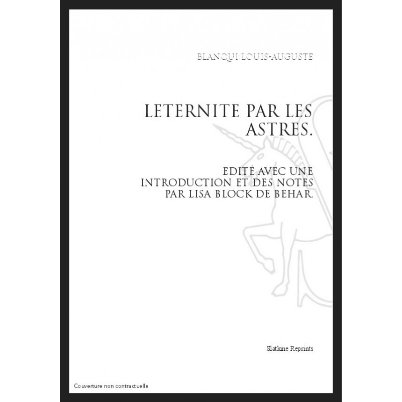 Moins connues que les violentes critiques de ses écrits politiques et de ses conspirations révolutionnaires, L'Éternité par les astres, de Louis-Auguste Blanqui propose une réflexion poétique d'une étrange actualité. Publié en 1872, écrit en prison où il fut longtemps enfermé, ce texte qui imagine une éternité insolite par la multiplication de mondes, a joué un rôle déterminant dans la pensée de Walter Benjamin et - ce qui est le plus étonnant - dans les fictions qui ont défini l'univers littéraire de J. L. Borges et Bioy Casères. Formulées comme une " hypothèse astronomiques ", ces énigmatiques conjectures scientifiques de Blanqui, plus que les insurrections qu'il avait provoquées, rachètent les sens d'une " révolution " qui atteint une vigueur inattendue. Pour réaliser cette nouvelle édition, et suivant le même procédé que l'auteur, Lisa Block de Behar est partie de la première édition de février 1872, en tenant compte des amendements et ajouts, ainsi que de la disposition différente adoptée par Blanqui en prison pour la réorganiser, quand il envisageait encore la possibilité de publier une seconde édition. Parmi les modifications, et en accord avec ses instructions, elle a inclus un appendice manuscrit intitulé " Sur l'enseignement de la cosmographie ", jamais publié jusqu'à présent.