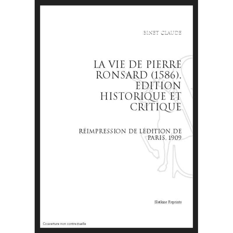 Édition critique de premier ordre, indispensable à toute étude sur Ronsard. Le texte du Discours de la vie de Pierre de Ronsard (édition de 1586 reproduite ici) est d`une exactitude scrupuleuse ; et on y trouve à côté d`une excellente introduction sur Binet, sur ses sources et sa méthode, une masse de renseignements, sous forme de notes, d`une grande utilité et qu`on chercherait vainement ailleurs. Claude Binet (1553-1600 environ), confident puis exécuteur testamentaire de Ronsard, fut lui-même homme de lettres et prépara le Tombeau littéraire du poète, y prenant la part la plus large avec l`églogue intitulée Perrot.