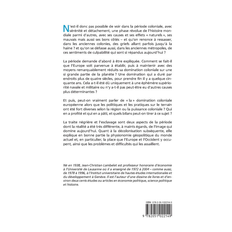 N`est-il donc pas possible de voir dans la période coloniale, avec sérénité et détachement, une phase révolue de l`histoire mondiale parmi d`autres, avec ses causes et ses effets "naturels", ses mauvais mais aussi ses bons côtés - et qu`on renonce à ressasser, dans les anciennes colonies, des griefs allant parfois jusqu`à a haine? et qu`on se défasse aussi, dans les anciennes métropoles, de ces sentiments de culpabilité qui sont si répandus aujourd`hui? La période demande d`abord à être expliquée. Comment se fait-il que l`Europe soit parvenue à établir, puis à maintenir avec des moyens remarquablement réduits sa domination coloniale sur une si grande partie de la planète? Une domination qui a duré par endroits plus de quatre siècles, pour prendre fin il y a quelque cinquante ans. Cela a-t-il été dû uniquement à une éphémère supériorité navale et militaire ou n`y a-t-il pas peut-être eu d`autres causes plus déterminantes? Et puis, peut-on vraiment parler de "la" domination coloniale européenne alors que les politiques et les pratiques sur le terrain ont été fort diverses selon la région ou la puissance coloniale? Qui en a profité et qui en a pâti, et quels bilans peut-on tirer à ce sujet? La traite négrière et l`esclavage sont deux aspects de la période dont la réalité a été très différente, à maints égards, de l`image qui domine aujourd`hui. Quant à la décolonisation subséquente, elle explique en bonne partie la physionomie géopolitique du monde actuel et, en particulier, la place que l`Europe et l`Occident y occupent, ainsi que les problèmes et difficultés qui les assaillent. Ne´ en 1938, Ne´ en 1938, Jean-Christian Lambelet est professeur honoraire d`économie a` l`Université´ de Lausanne où il a enseigné de 1972 à 2004, comme aussi, de 1978 à 1996, à l`Institut universitaire de hautes études internationales et du développement à Genève. Il est l`auteur d`une dizaine de livres et d`environ deux cents études ou articles en économie politique, science politique et histoire.