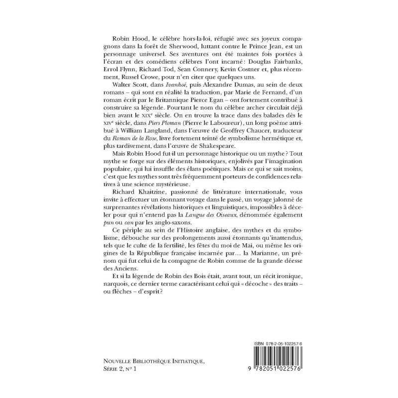 Robin Hood, le célèbre hors-la-loi, réfugié avec ses joyeux compagnons dans la forêt de Sherwood, luttant contre le Prince Jean est un personnage universel. Ses aventures ont été maintes fois portées à l`écran et des comédiens célèbres l`ont incarné: Douglas Fairbanks, Errol Flynn, Richard Todd, Sean Connery, Kevin Costner et, plus récemment, Russel Crowe, pour n`en citer que quelques-uns. Walter Scott, dans Ivanhoé, puis Alexandre Dumas, au sein de deux romans - qui sont en réalité la traduction, par Marie de Fernand, d`un roman écrit par le Britannique Pierce Egan - ont fortement contribué à construire sa légende. Pourtant le nom du célèbre archer circulait déjà bien avant le XIXe siècle. On en trouve la trace dans des ballades dès le XIVe, dans Piers Plowman (Pierre le Laboureur), un long poème, attribué à William Langland, dans l`œuvre de Geoffrey Chaucer, traducteur du Roman de la Rose, livre fortement teinté de symbolisme hermétique et, plus tardivement, dans l`oeuvre de Shakespeare. Mais Robin Hood fut-il un personnage historique ou un mythe ? Tout mythe se forge sur des éléments historiques, enjolivés par l`imagination populaire, qui lui insuffle des élans poétiques. Mais ce qui se sait moins, c`est que les mythes sont très fréquemment porteurs de confidences relatives à une science mystérieuse. Richard Khaïtzine, bien connu du monde de l`ésotérisme et féru de littérature internationale, nous invite à effectuer un étonnant voyage dans le passé, un voyage jalonné de surprenantes révélations historiques et linguistiques, impossibles à déceler pour qui n`entend pas la Langue des Oiseaux, dénommée également pun ou cant par les anglo-saxons. Ce périple au sein de l`Histoire anglaise, des mythes et du symbolisme, débouche sur des prolongements aussi étonnants qu`inattendus, tels que le culte de la fertilité, les fêtes du mois de Mai ou même les origines de la république française incarnée par… la Marianne, un prénom qui fut celui de la compagne de Robin comme de la grande déesse des Anciens.
