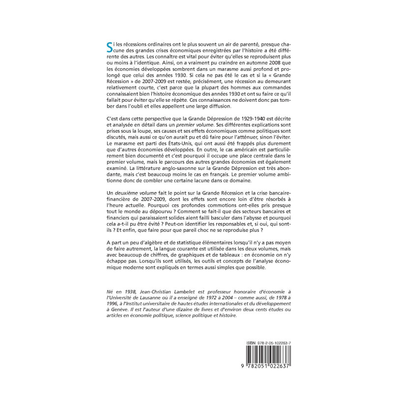 Si les récessions ordinaires ont le plus souvent un air de parenté, presque chacune des grandes crises économiques enregistrées par l`histoire a été différente des autres. Les connaître est vital pour éviter qu`elles se reproduisent plus ou moins à l`identique. Ainsi, on a vraiment pu craindre en automne 2008 que les économies développées sombrent dans un marasme aussi profond et prolongé que celui des années 1930. Si cela ne pas été le cas et si la " Grande Récession " de 2007-2009 est restée, précisément, une récession au demeurant relativement courte, c`est parce que la plupart des hommes aux commandes connaissaient bien l`histoire économique des années 1930 et ont su faire ce qu`il fallait pour éviter qu`elle se répète. Ces connaissances ne doivent donc pas tomber dans l`oubli et elles appellent une large diffusion. C`est dans cette perspective que la Grande Dépression de 1929-1940 est décrite et analysée en détail dans un premier volume. Ses différentes explications sont prises sous la loupe, ses causes et ses effets économiques comme politiques sont discutés, mais aussi ce qu`on aurait pu et dû faire pour l`atténuer, sinon l`éviter. Le marasme est parti des États-Unis, qui ont aussi été frappés plus durement que d`autres économies développées. En outre, le cas américain est particulièrement bien documenté et c`est pourquoi il occupe une place centrale dans le premier volume, mais le parcours des autres grandes économies est également examiné. La littérature anglo-saxonne sur la Grande Dépression est très abondante, mais c`est beaucoup moins le cas en français. Le premier volume ambitionne donc de combler une certaine lacune dans ce domaine. Un deuxième volume fait le point sur la Grande Récession et la crise bancaire-financière de 2007-2009, dont les effets sont encore loin d`être résorbés à l`heure actuelle. Pourquoi ces profondes commotions ont-elles pris presque tout le monde au dépourvu ? Comment se fait-il que des secteurs bancaires et financiers qui paraissaient solides aient failli basculer dans l`a